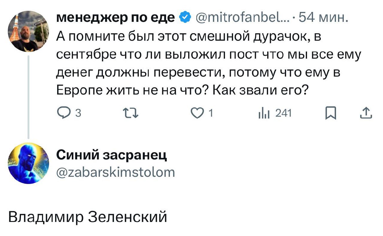 3248 Ignatbrat Логично 4 дня назад Скриншот Политика X (Twitter) Украинцы Троллинг Стеб Владимир Зеленский Фейк Юмор Комментарии 494 72 16 8 3 1 1 Ещё 2