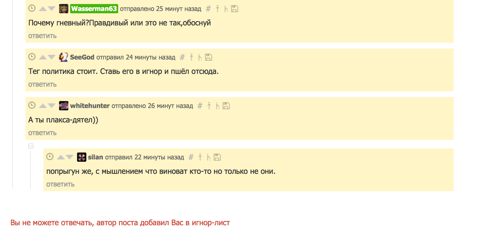 Viking1997 Логика... 9 лет назад Кому я могу что-то обосновать, если он меня еще и в игнор кинул? Теперь я типа не могу ответить за свои слова, отчего думают, что меня в споре победили даже не начав дискуссии. Многоходовочка. Идиотизм Многоходовка Логика Пикабу