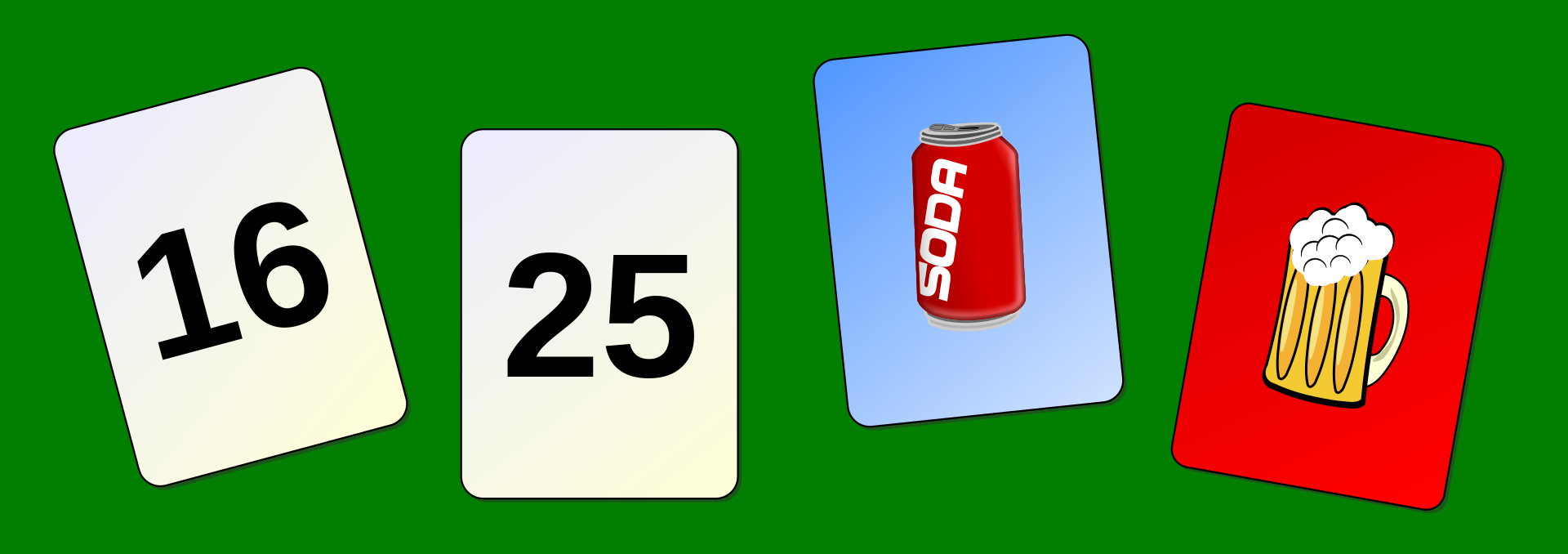 С одной стороны у карт цифры, а с другой — красная или зелёная рубашка. У вас есть правило: если карта чётная, то рубашка у неё красная. Вам нужно проверить соблюдается ли это правило для всех четырёх карт. Какие карты необходимо перевернуть для проверки этого правила? Как и в прошлый раз предлагаю вам немного подумать, чтобы было интереснее.