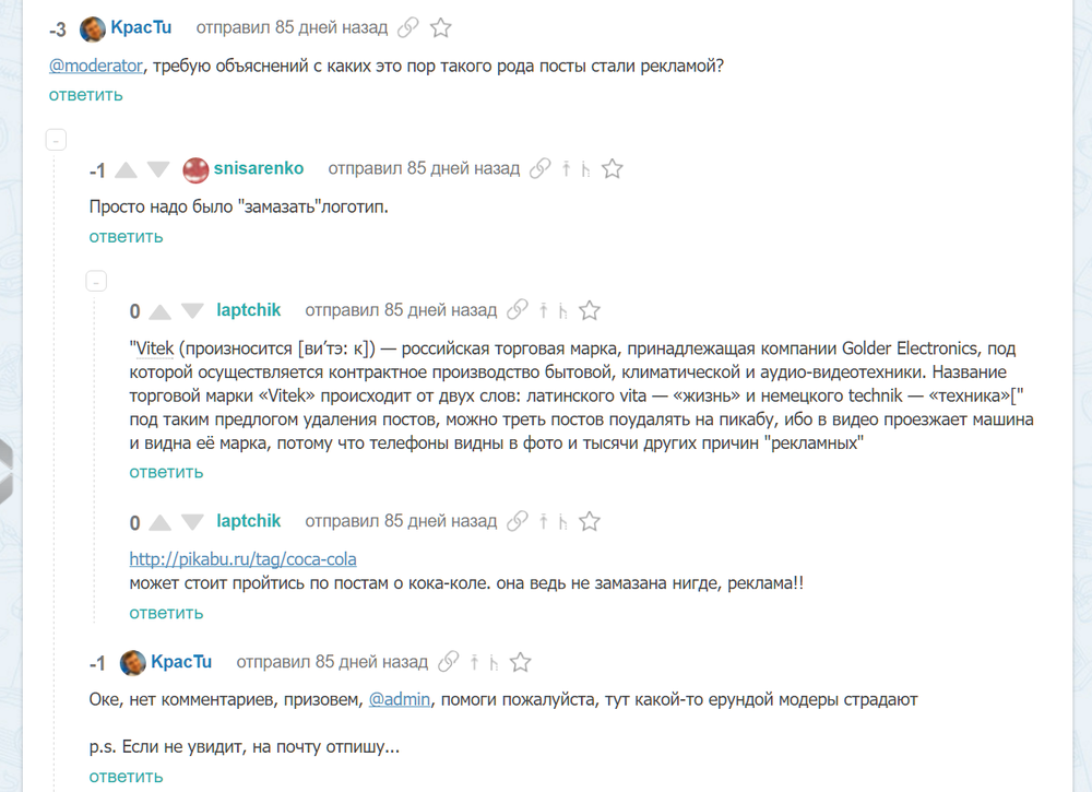 Почему мой пост(картинка 2) был забанен доблестным модератором по причине "Реклама"(на скриншоте на всякий случай удалил бренд)