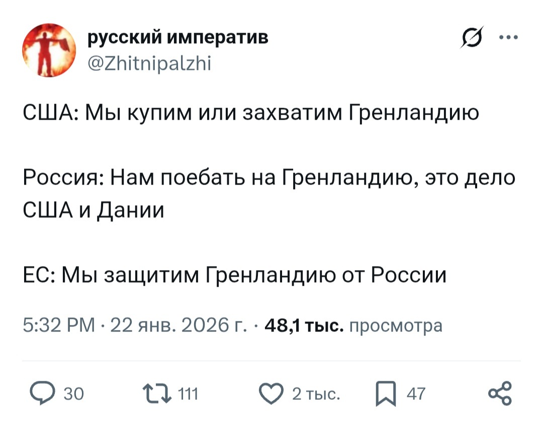 3154 morevnaM Политика Логика отсутствует полностью1 9 дней назад https://x.com/Zhitnipalzhi/status/2014345388115800517 https://www.rbc.ru/politics/21/01/2026/696f9b4b9a7947efca3d6... https://lenta.ru/news/2026/01/22/eto-nas-ne-kasaetsya-sovers... https://www.rbc.ru/politics/22/01/2026/6971e8f39a79475a2015c... https://www.rbc.ru/politics/22/01/2026/697221fd9a7947b761772... X (Twitter) Скриншот Россия США Евросоюз Европа Гренландия Ссылка Политика Логика Мат 556 53 28 7 6 3 1 1 Ещё 3