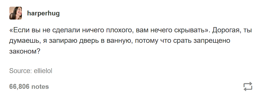 3541 IgnatGryniawicki Логика пользователей, которые говорят, что им нечего скрывать 3 года назад Source. Tumblr Конфиденциальность Скриншот 29 2 1 1 1 Ещё 0