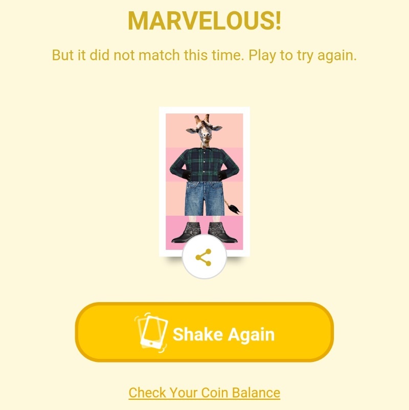 Первая игра за одну попытку требует заплатить одну монету. Предлагается каким-то определенным образом трясти телефон, чтобы совпали все 4 части картинки.