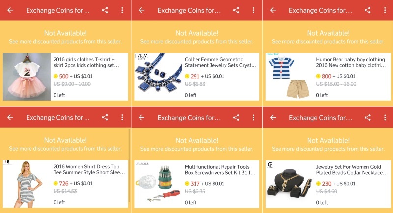 Ну и я решил их попробовать потратить. Первое что пришло на ум, просто приобрести купон, действующий по всему AliExpress. По задумке авторов, каждый час доступно определенное количество купонов: номиналом в $1 – 40 шт, $3 – 10 шт, $8 – 1 шт. Но вот незадача. Эти купоны типа расхватывают в первые же секунды их доступности. Только это опять же похоже все на лохотрон. Я пробовал несколько раз в первую же секунду пытаться ухватить хотя бы однодолларовый купон. Но все тщетно. Заходишь и тебе тут же пишут Not Available! Ни разу не видел доступные купоны в этом разделе. Вот честно.