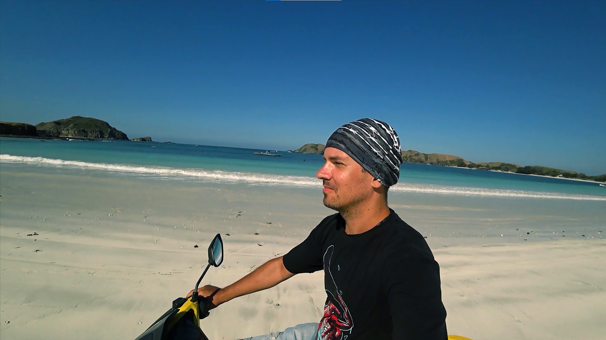 Песок ближе к воде довольно твёрдый и поэтому там даже можно катать на скутере. Это огонь, товарищи!
