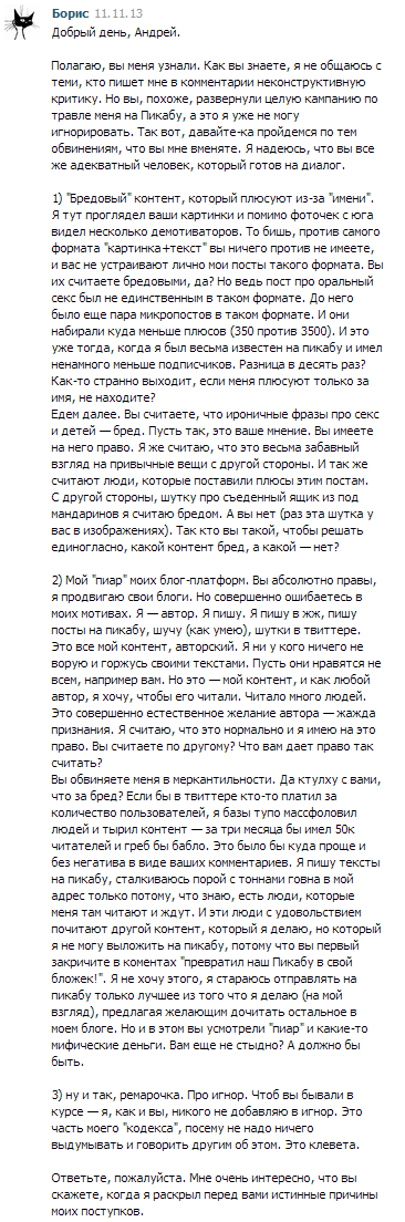 сколько страстей из-за плюсиков на пикабу. сколько страстей из-за постов лл, которые, хоть и супер-авторские, но очень редко несут в себе что-то новое и интересное, лично я их не читаю и не плюсую. но они хотя бы авторские, и ничуть не хуже тонн смищных комментов вк, котиков и прочей милоты. и так же есть куча постов, где индивиды с богатым внутренним миром выкладывают свои стишки и прочее творчество со ссылками на бложики. имхо, весь этот раздутый конфликт - просто бред.