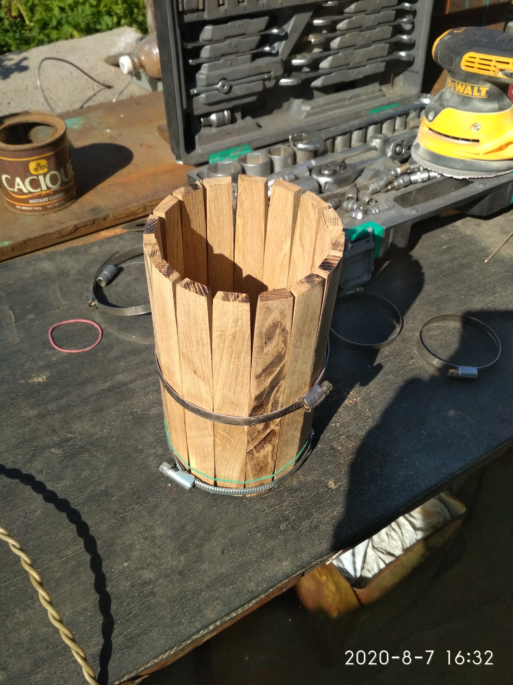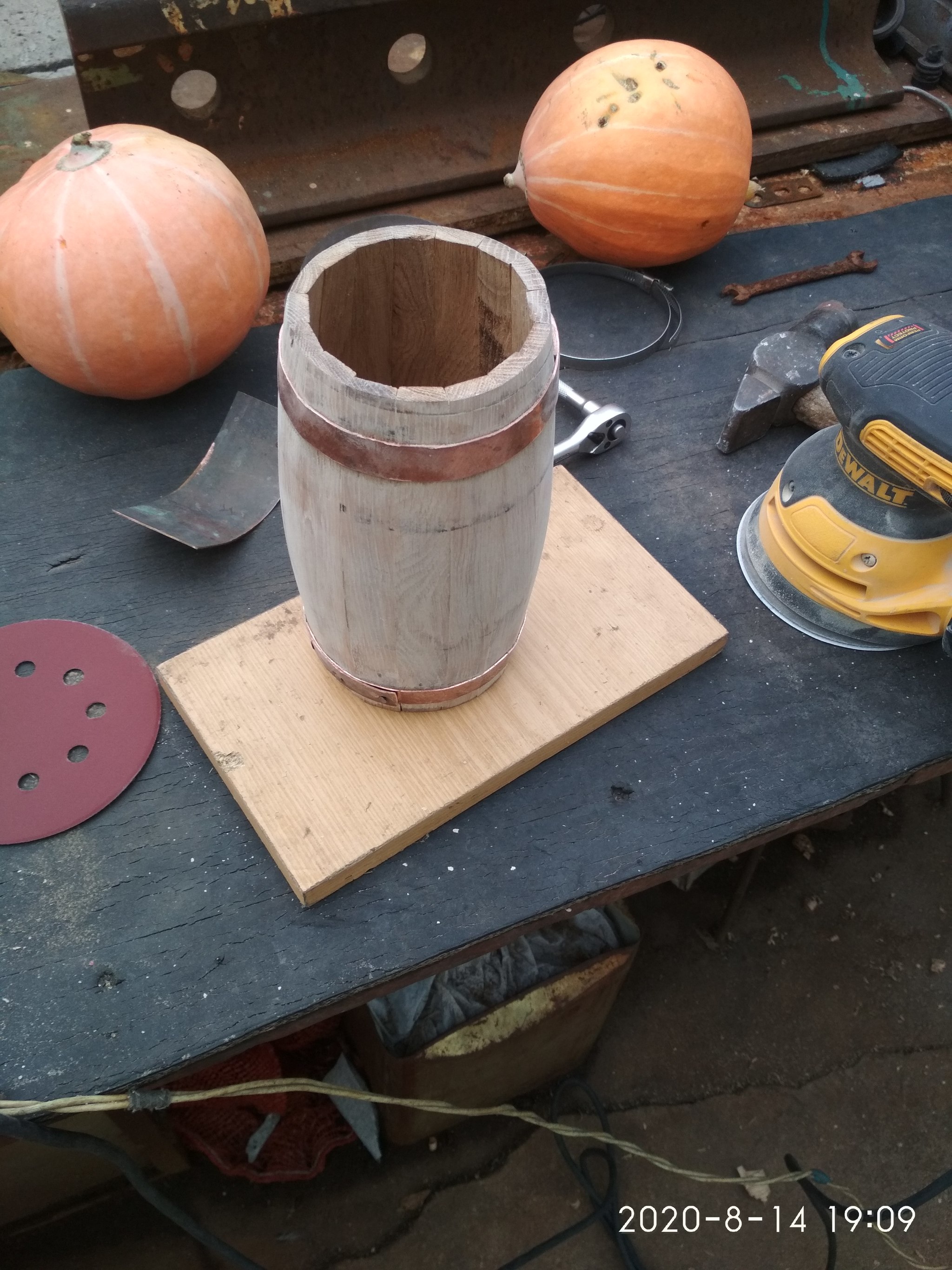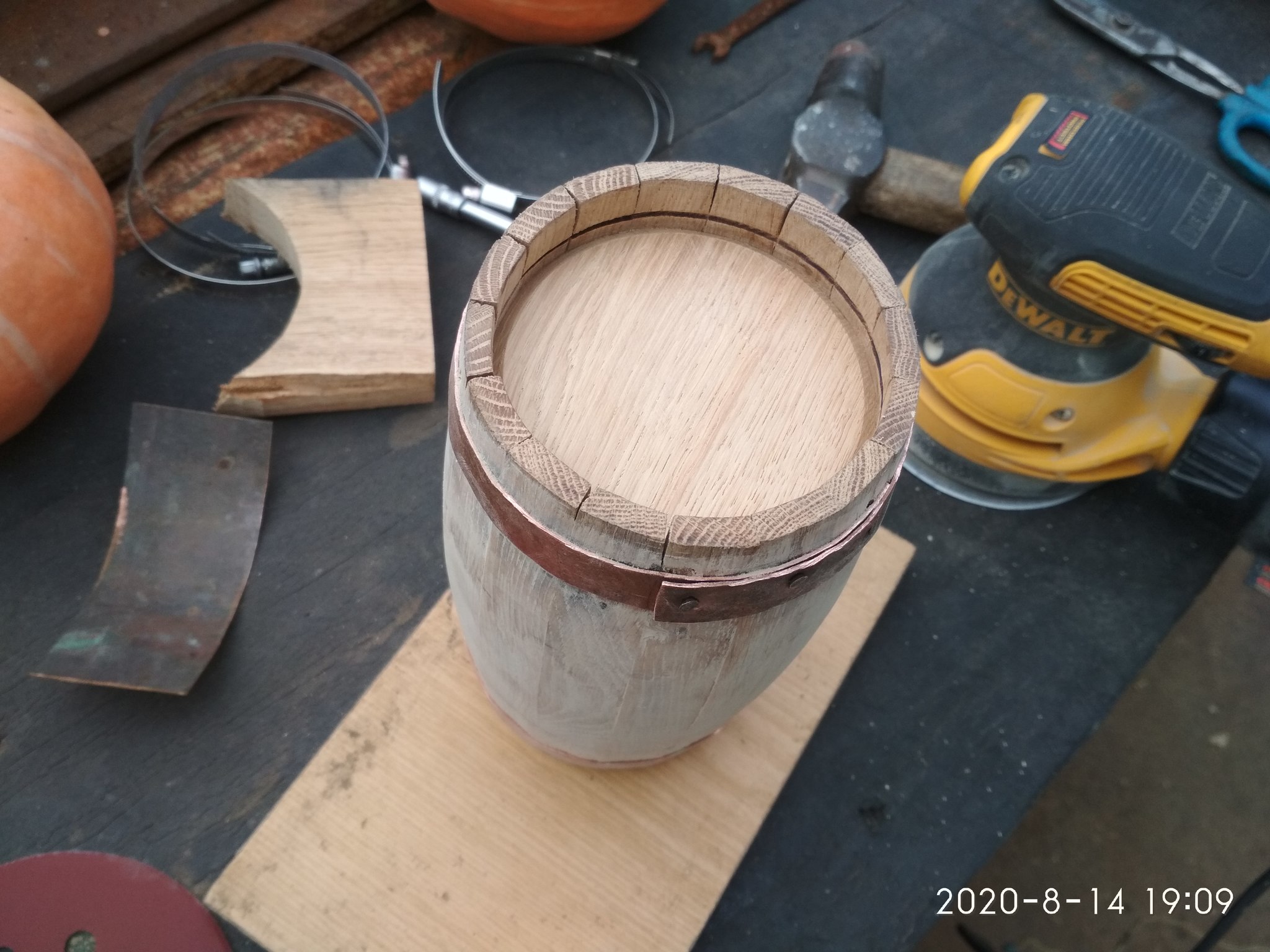 Потом обручи. Медные, склепанные медными гвоздями. Сильно не выводил, сделал погрубее.