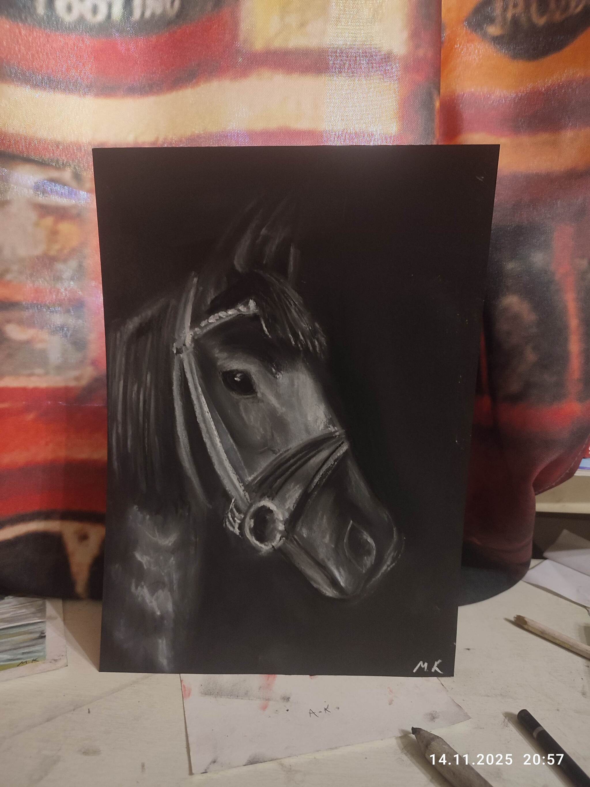 Лошадь, пастель, черная бумага