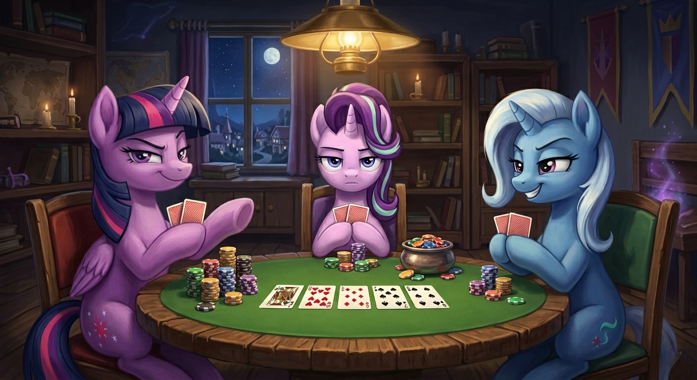 21 D.Kalashnikov My Little Pony Лошадиный покер 1 день назад [моё] Контент нейросетей My Little Pony Twilight Sparkle Trixie Starlight Glimmer Покер 4 Ещё 0