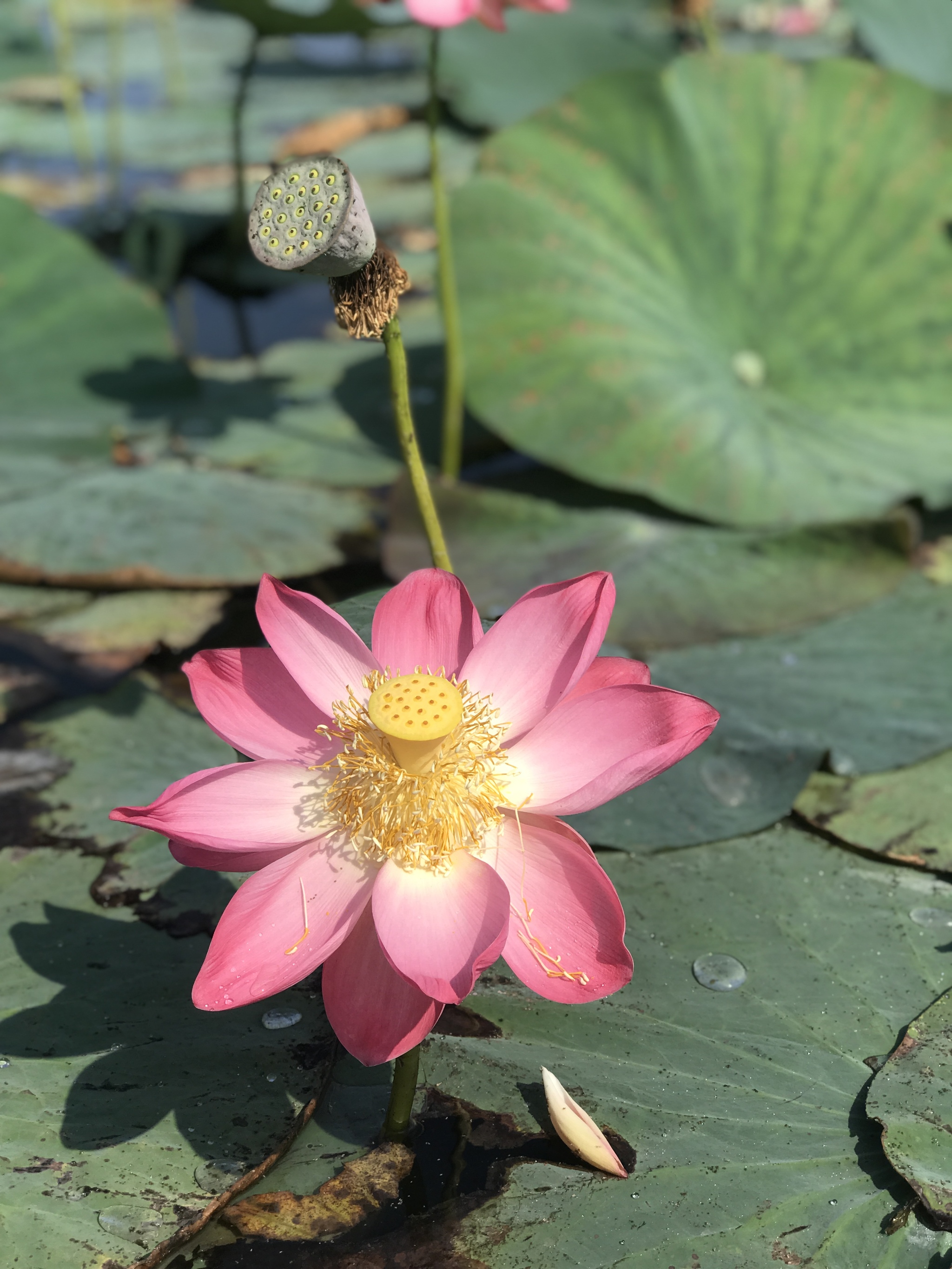 На одном фото - вся летняя жизнь цветка: бутон, цветущий лотос, отцветающий и коробочка с семенами.