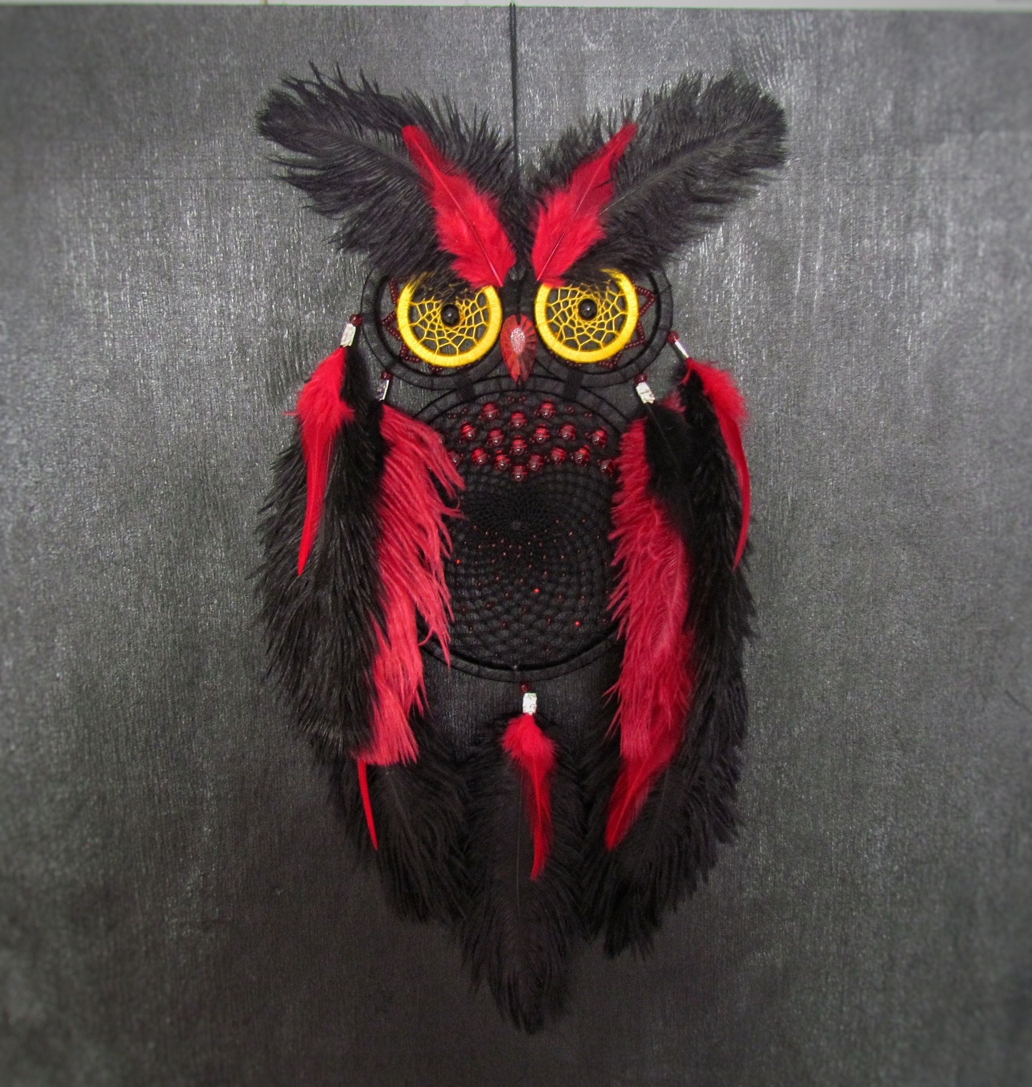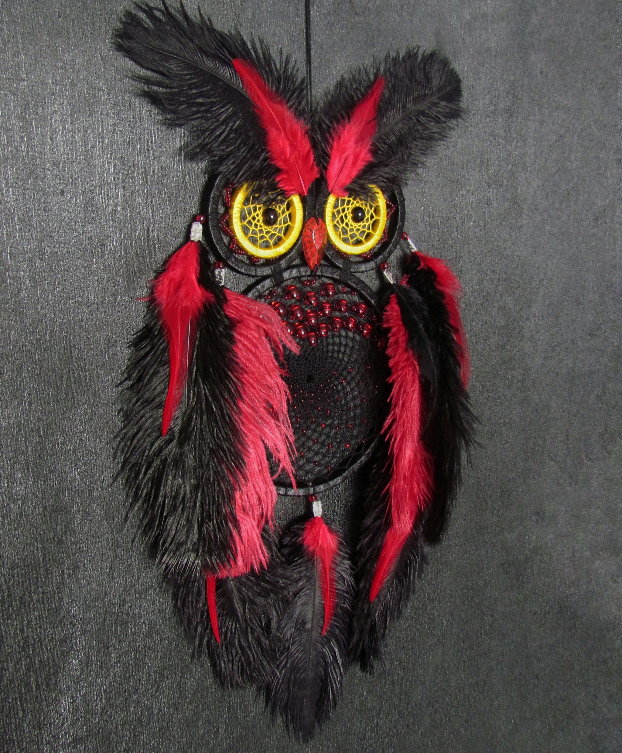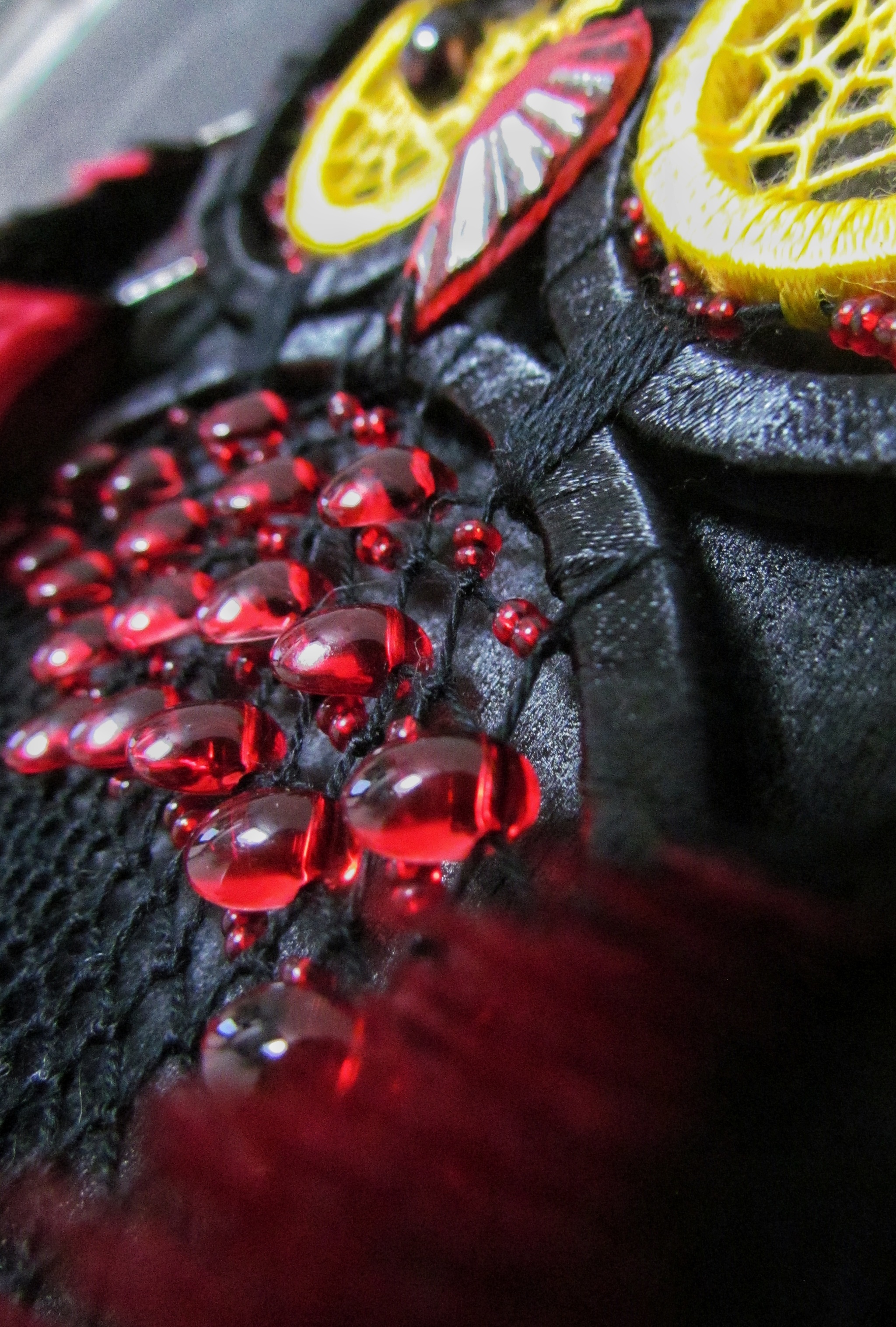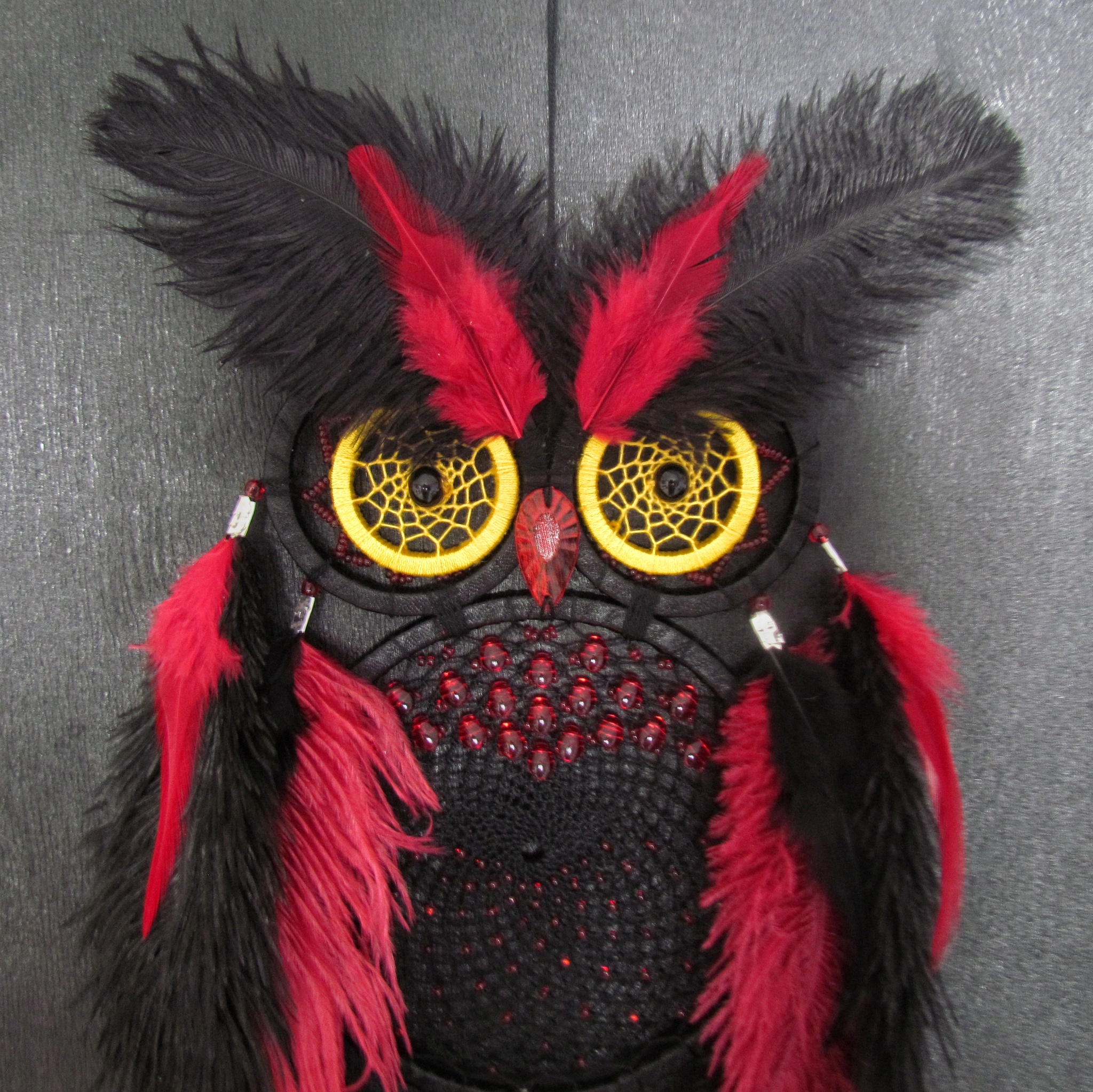Вначале планировала сделать её абсолютно чёрной и мрачной типа "я ужас, летящий на крыльях ночи". Но потом, уже в процессе, стало ясно, что красные перья её только украсят и сделают интереснее. Надеюсь, у меня это получилось)