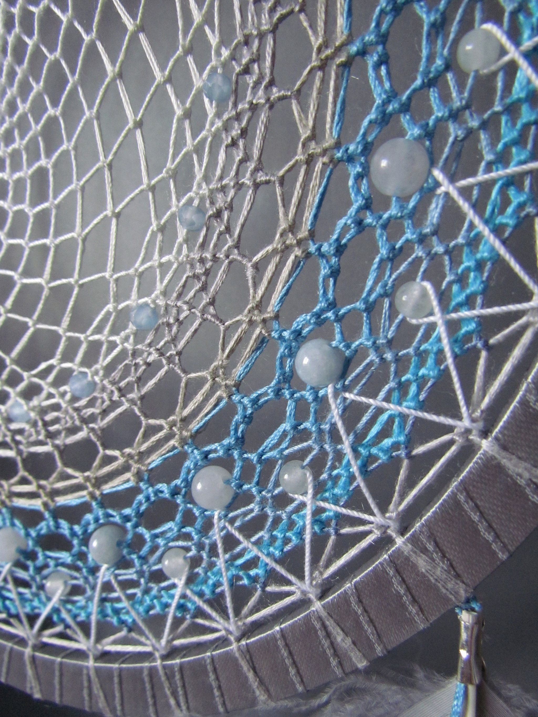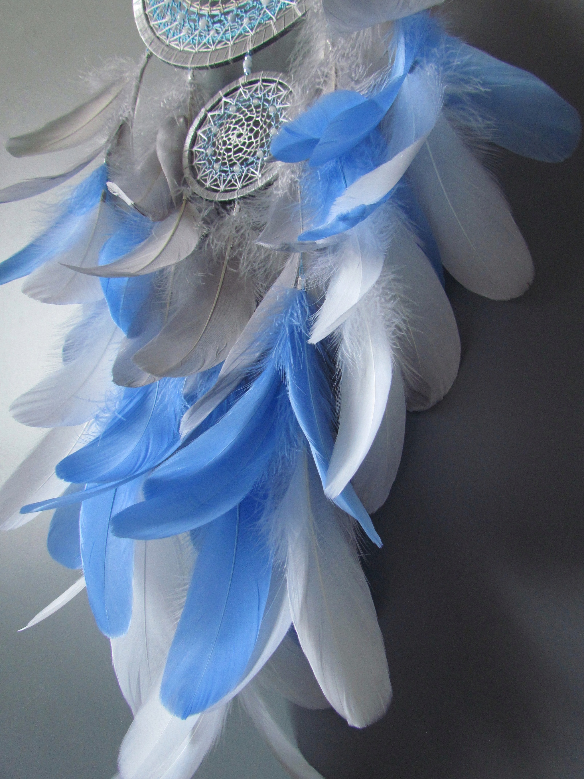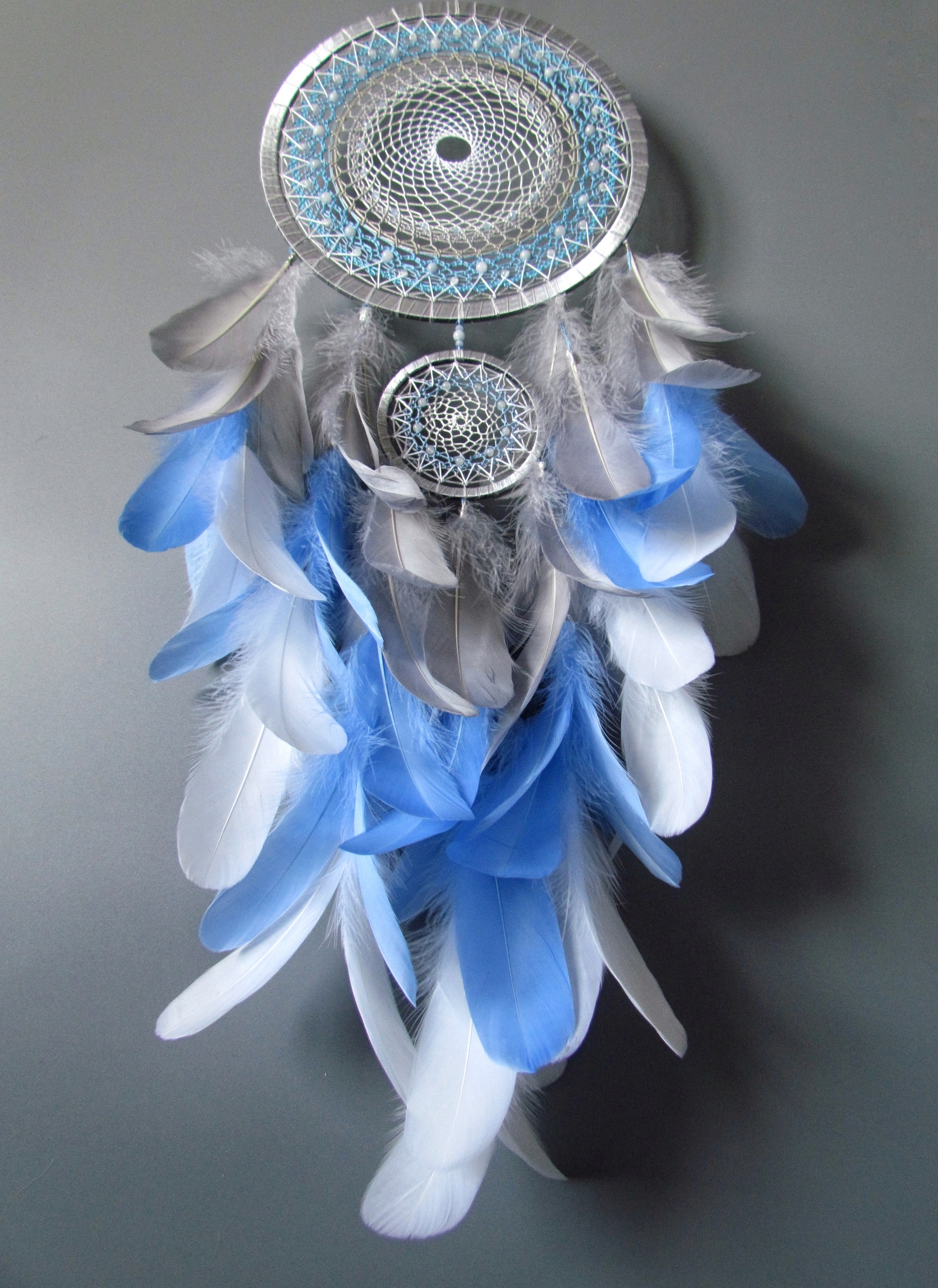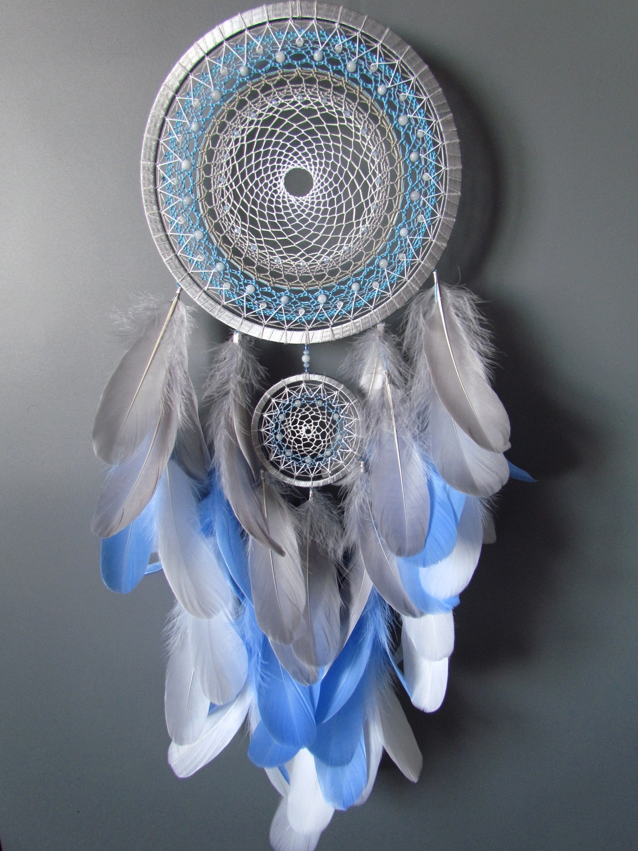 Я купила себе новый фотофон, поэтому все новые работы теперь будут на сером фоне) и первый ловец, который я на нем отсняла, тоже оказался серым) я уже делала несколько ловцов в такой цветовой гамме, она очень удачно смотрится в интерьере. Но такой большой заказали впервые, и я смогла впихнуть в него и стеклянные бусинки, и льдистого цвета аквамарин. А кольца переливаются стальным, холодным блеском)