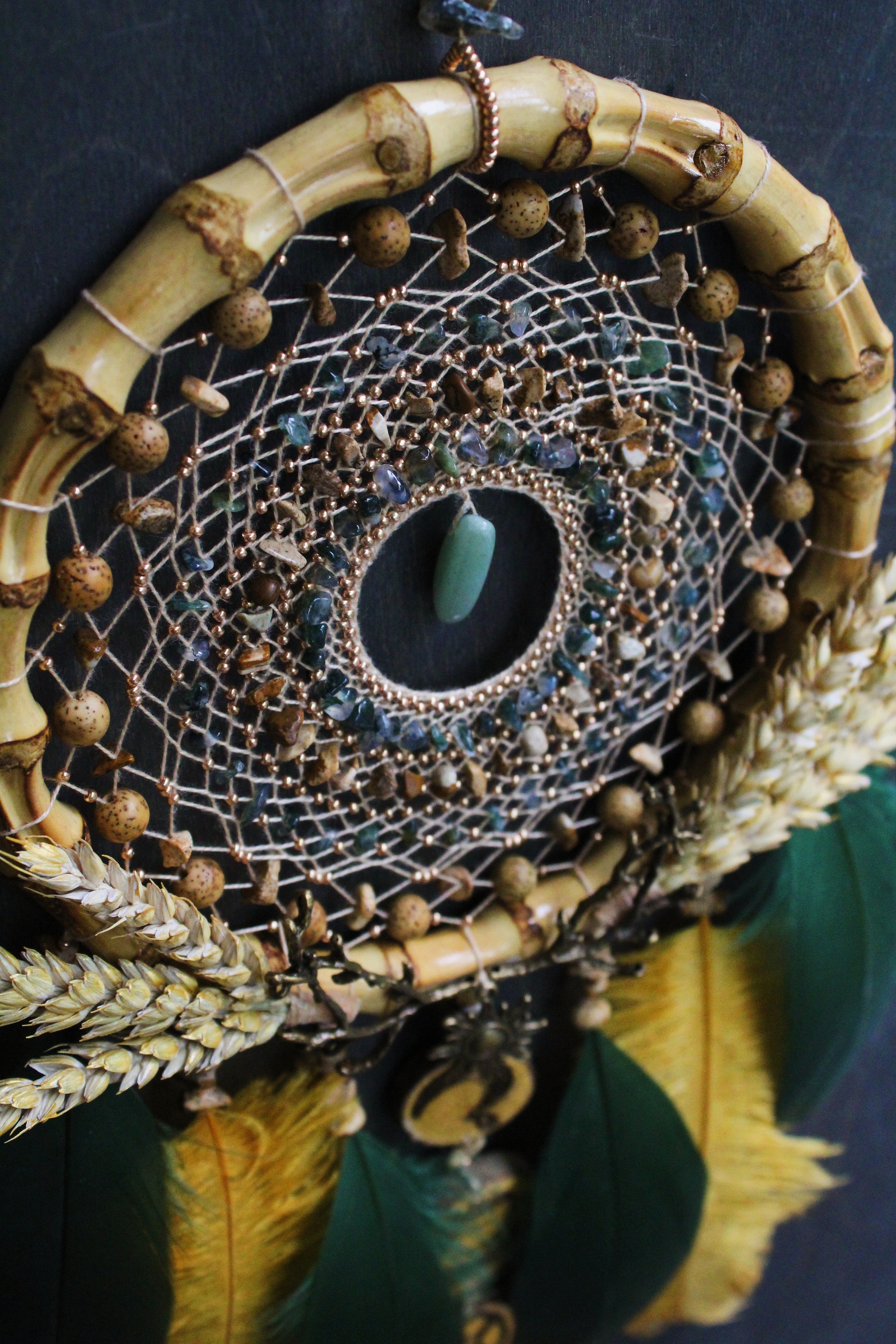 Каст камней этого Ловца - яшма и агат, почётное место в центре занял авантюрин. Так же в плетении использованы бусины из семян лотоса.