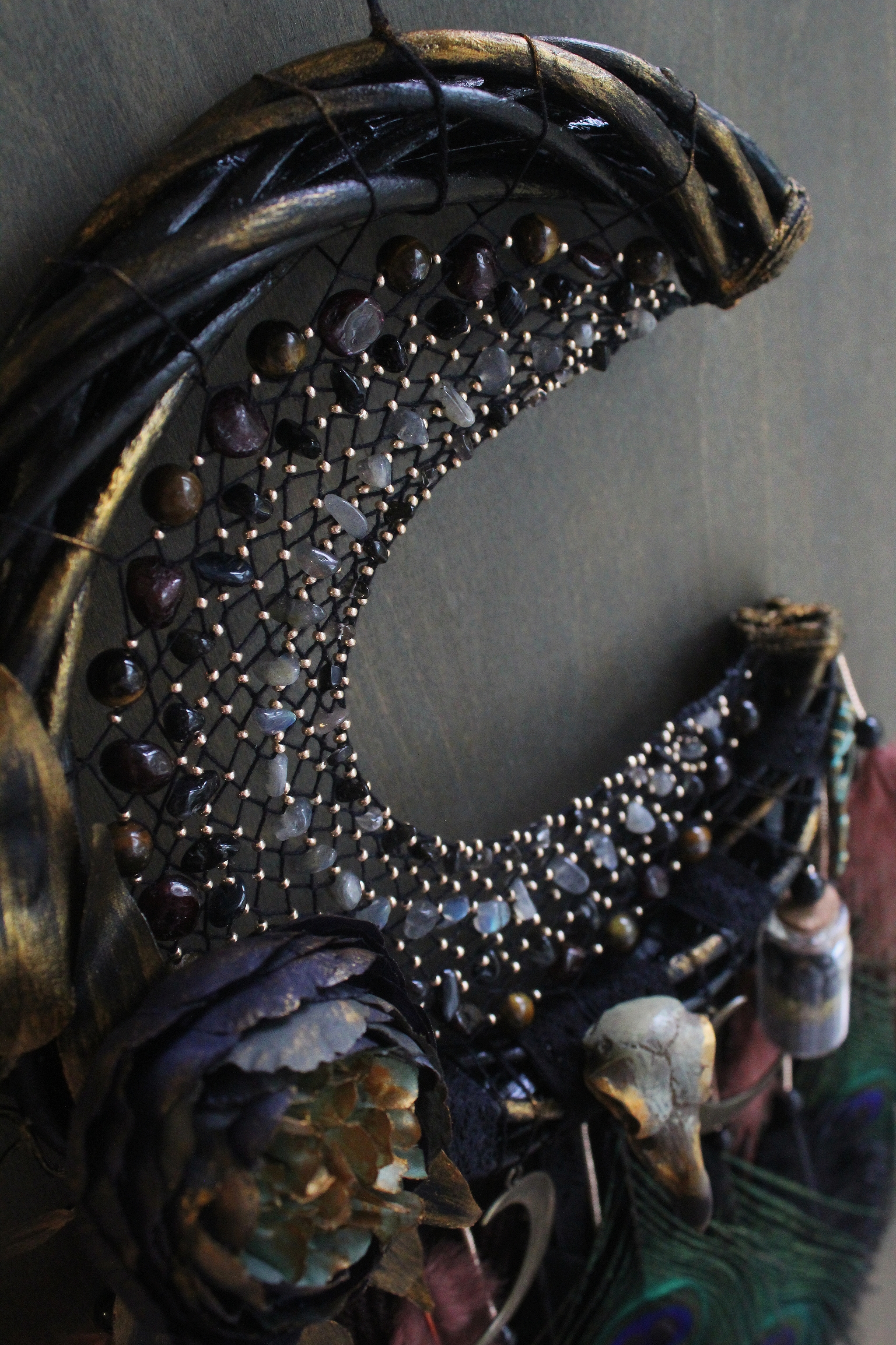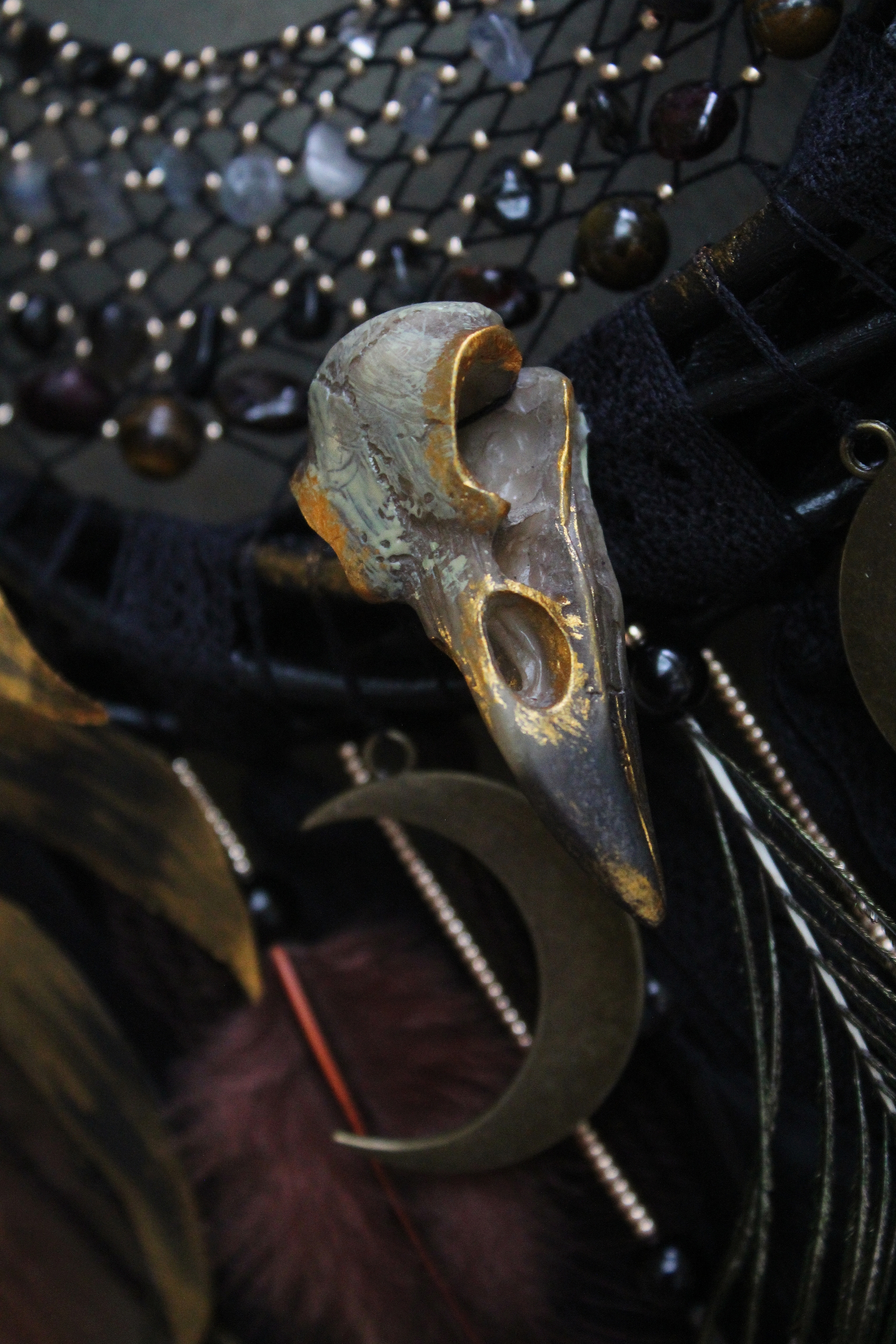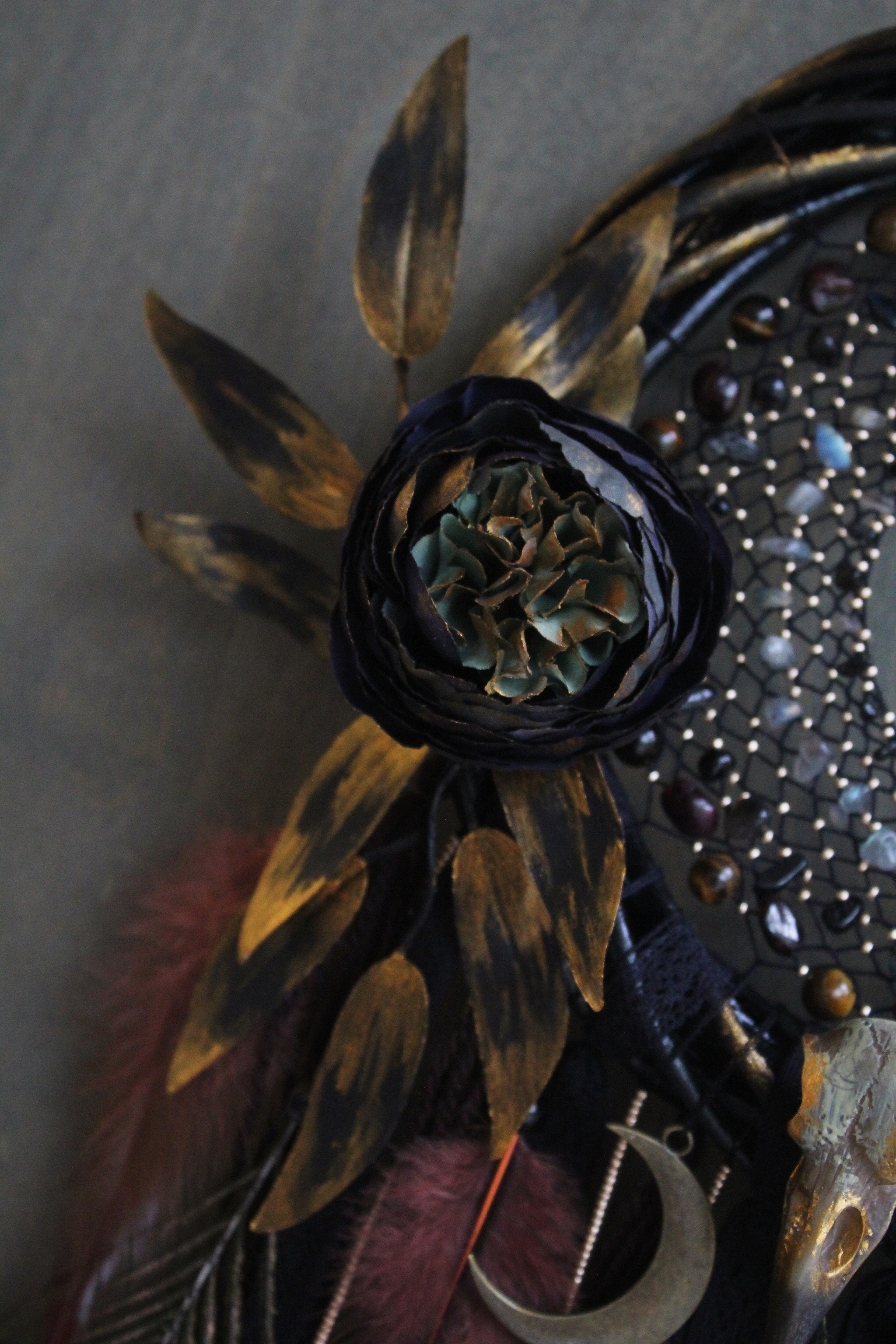 Ловец украшен птичьим черепом из полимера, подвесками в виде лунниц, цветком и листьями из ткани (окрашенными в ручную) и подвеской-ключом с патиной, которая просто нереально красиво перекликается с сердцевиной цветка и переливами на перьях павлина