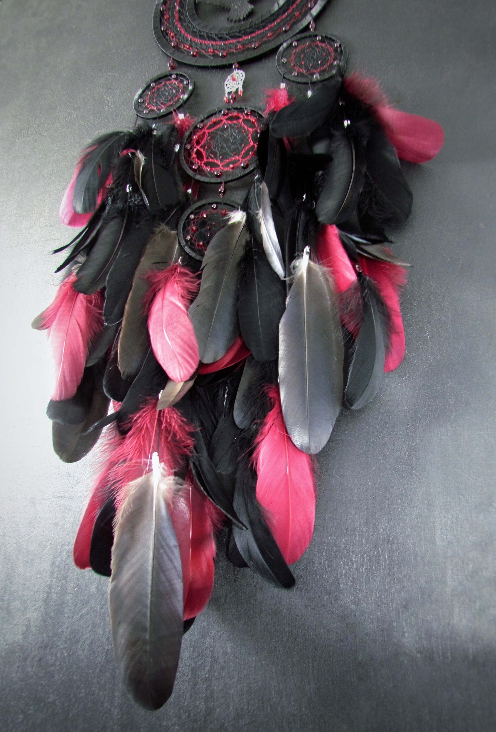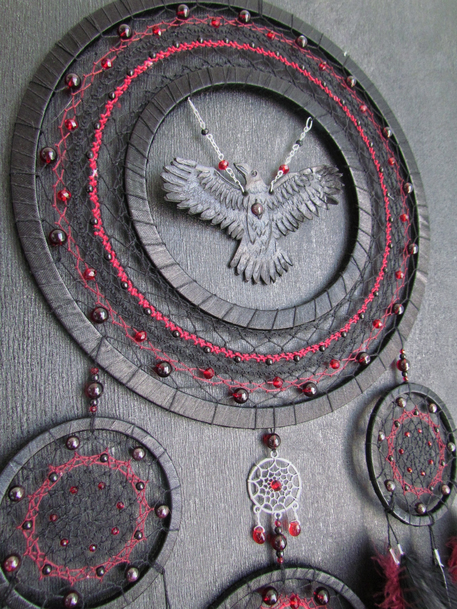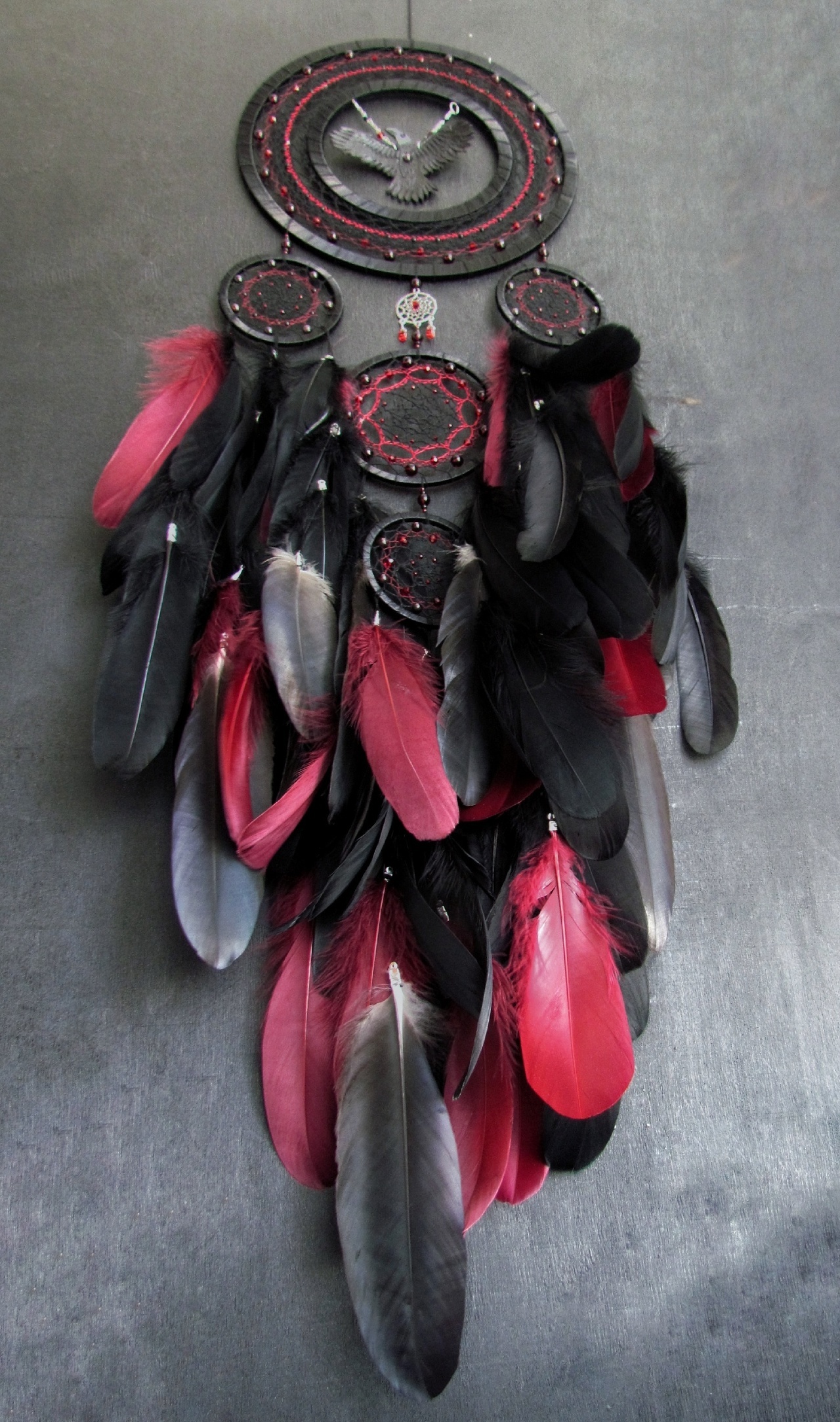 Поистине необычный ловец снов в длину более метра. Центральная фигура - вóрон ручной работы из натуральной кожи, его я заказывала отдельно у мастера. В такой ловец мне хотелось добавить все самое лучшее, поэтому вместо стекла были использованы бусины из натурального граната и халцедона. Ну и, конечно, обязательным атрибутом являются натуральные перья из крыльев вóрона. Нечасто удаётся найти в продаже такие крупные и аккуратные перья линьки, действительно повезло! Зато смотрите, какой готичный красавец получился)