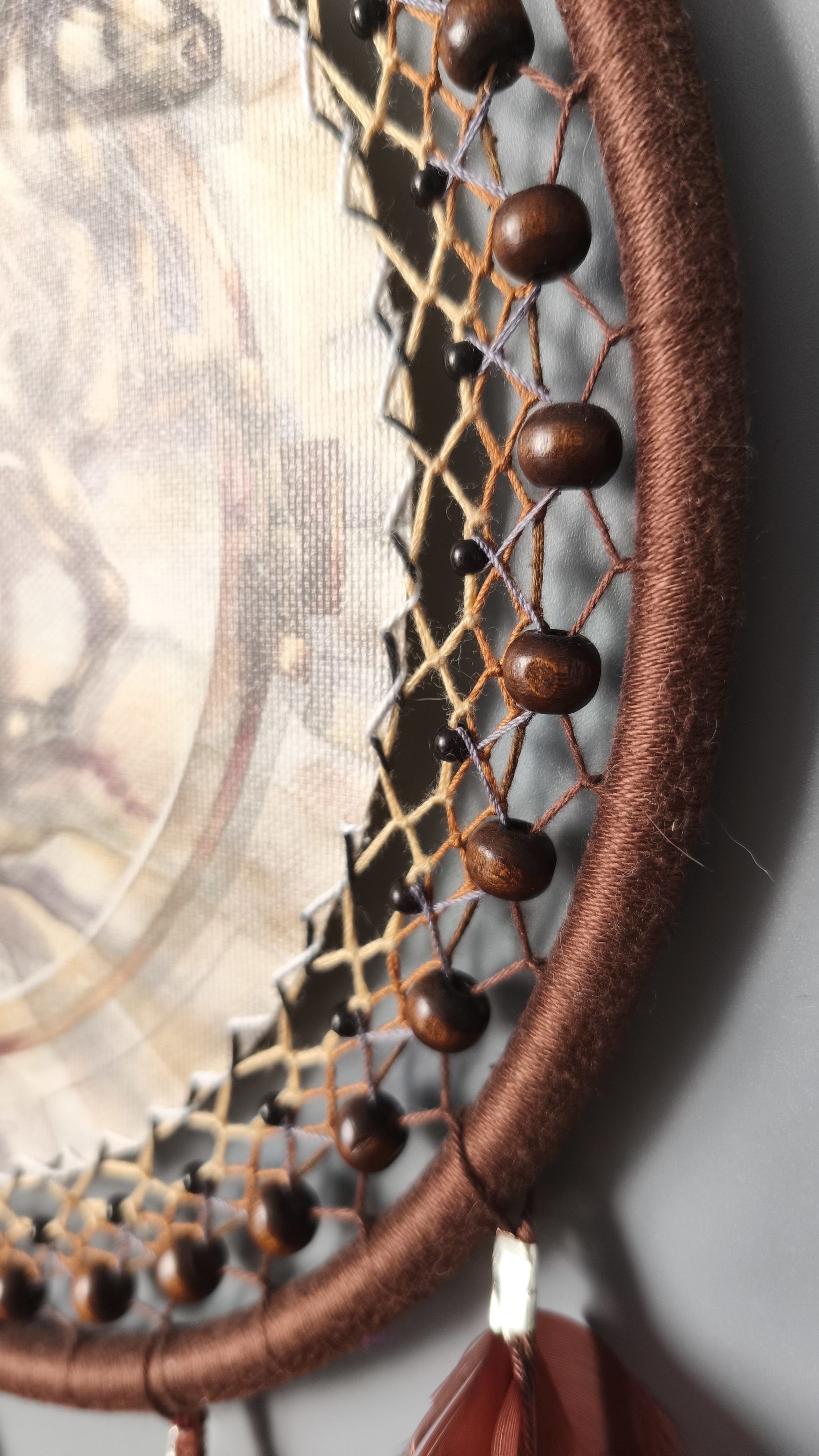 В первый день зимы хочу показать вам ловец снов с символом наступающего года. Всегда восхищалась этими чудесными животными, и делать ловец с такой картинкой было одно удовольствие) а деревянные бусины и коричневые теплые оттенки делают ловец очень уютным)
