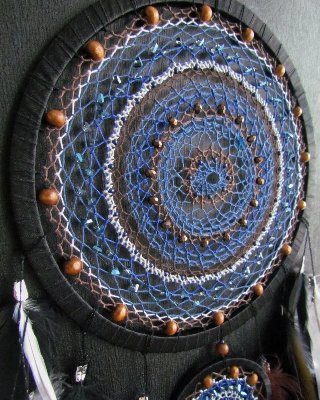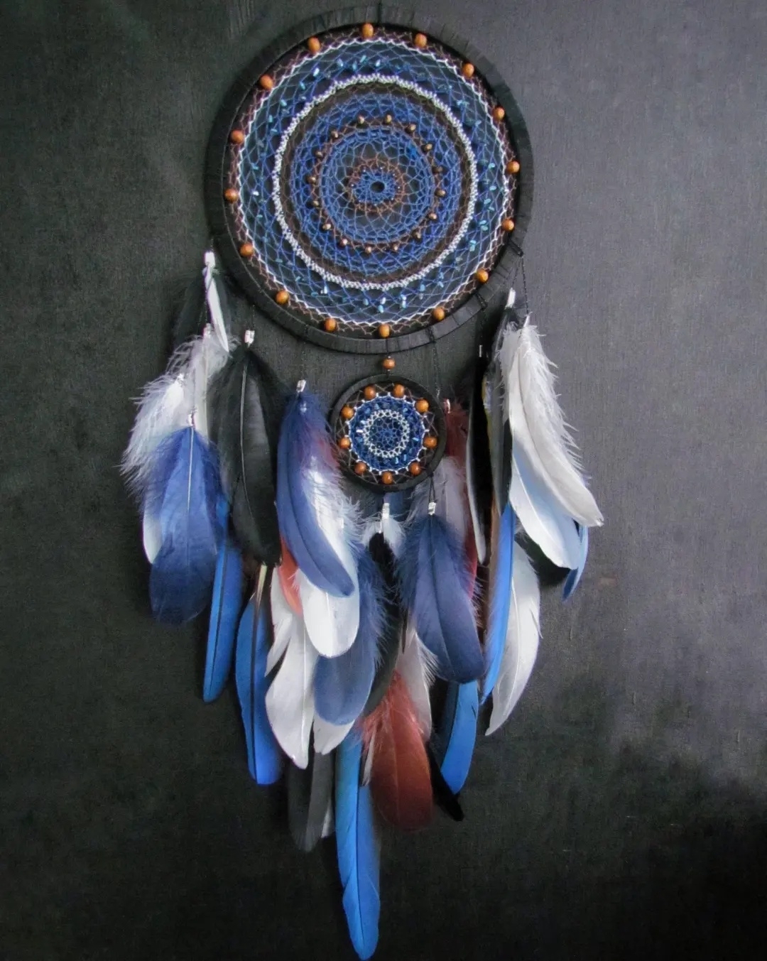У меня дома ещё оставалось несколько перьев от попугая ара, доставшихся мне благодаря отзывчивым пикабушникам) и вот какой ловец снов с ними получился) мне нравится сочетание синего и коричневого, смотрится очень нарядно