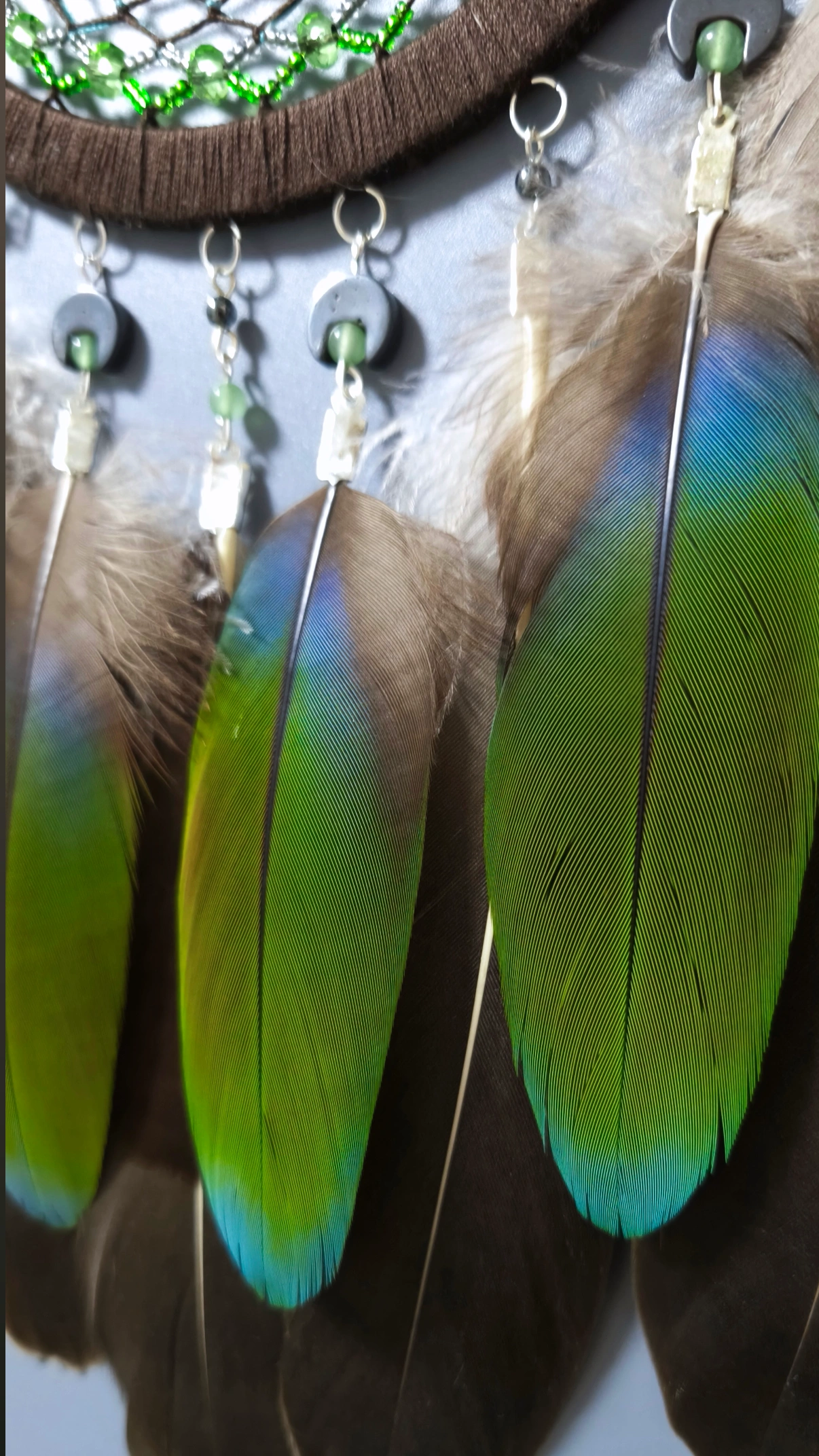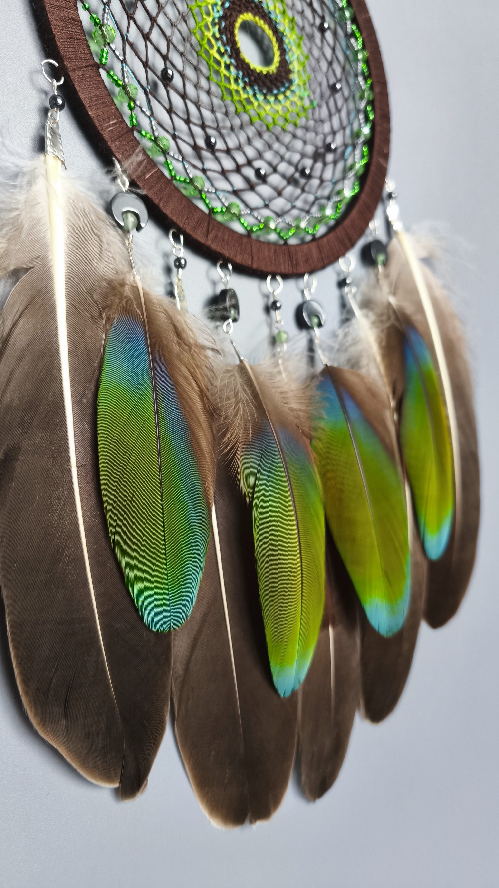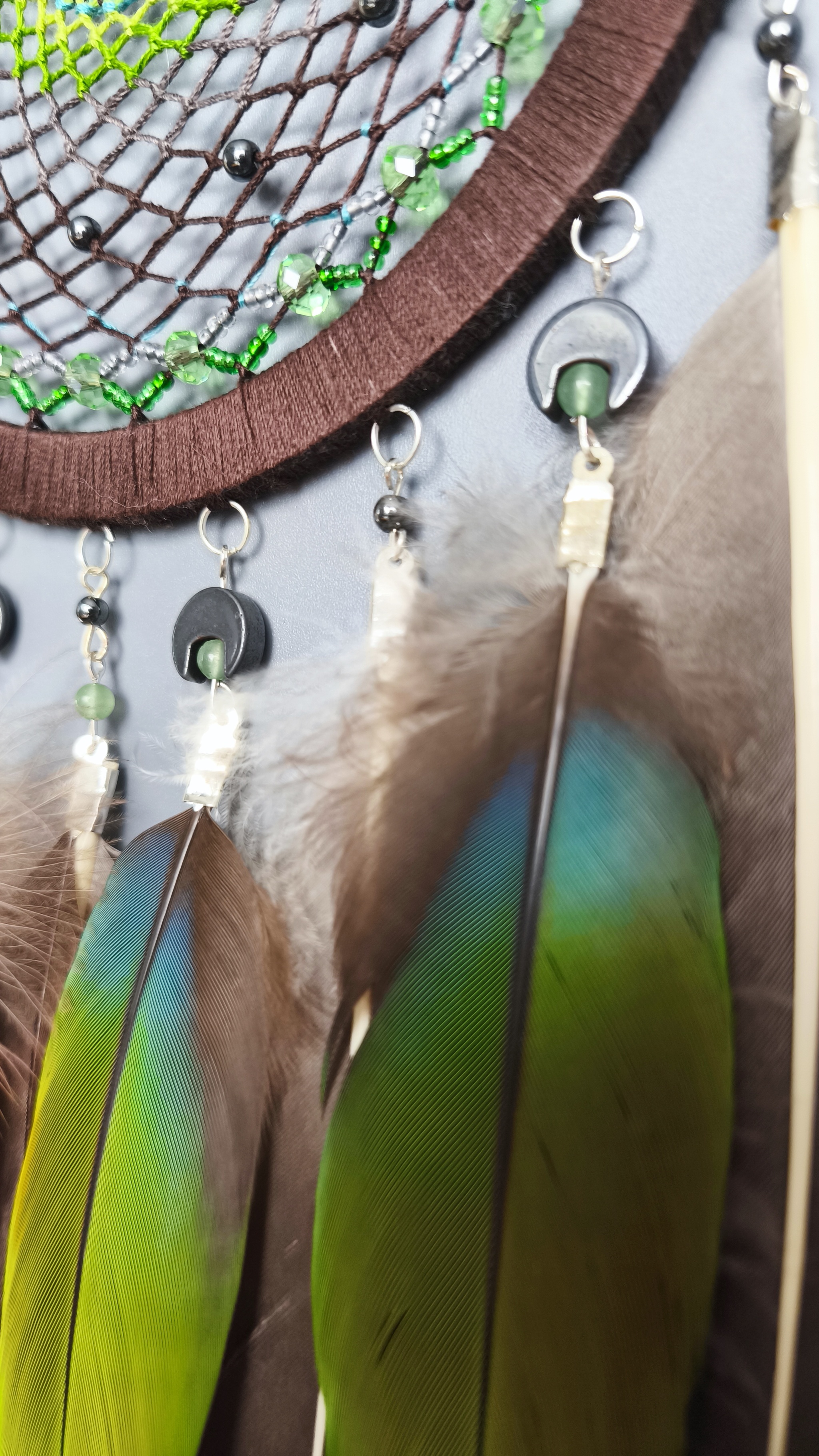 На самом деле делала я его таким не специально) я просто подбирала цвет ниток под перья, а вышло вот как в итоге) кстати перья тут очень красивые - это гусь и попугай ара, который меняет свой оттенок в зависимости от освещения. А ещё нашла у себя бусины из гематита в форме полумесяцев, и они тоже хорошо вписались в этот ловец)
