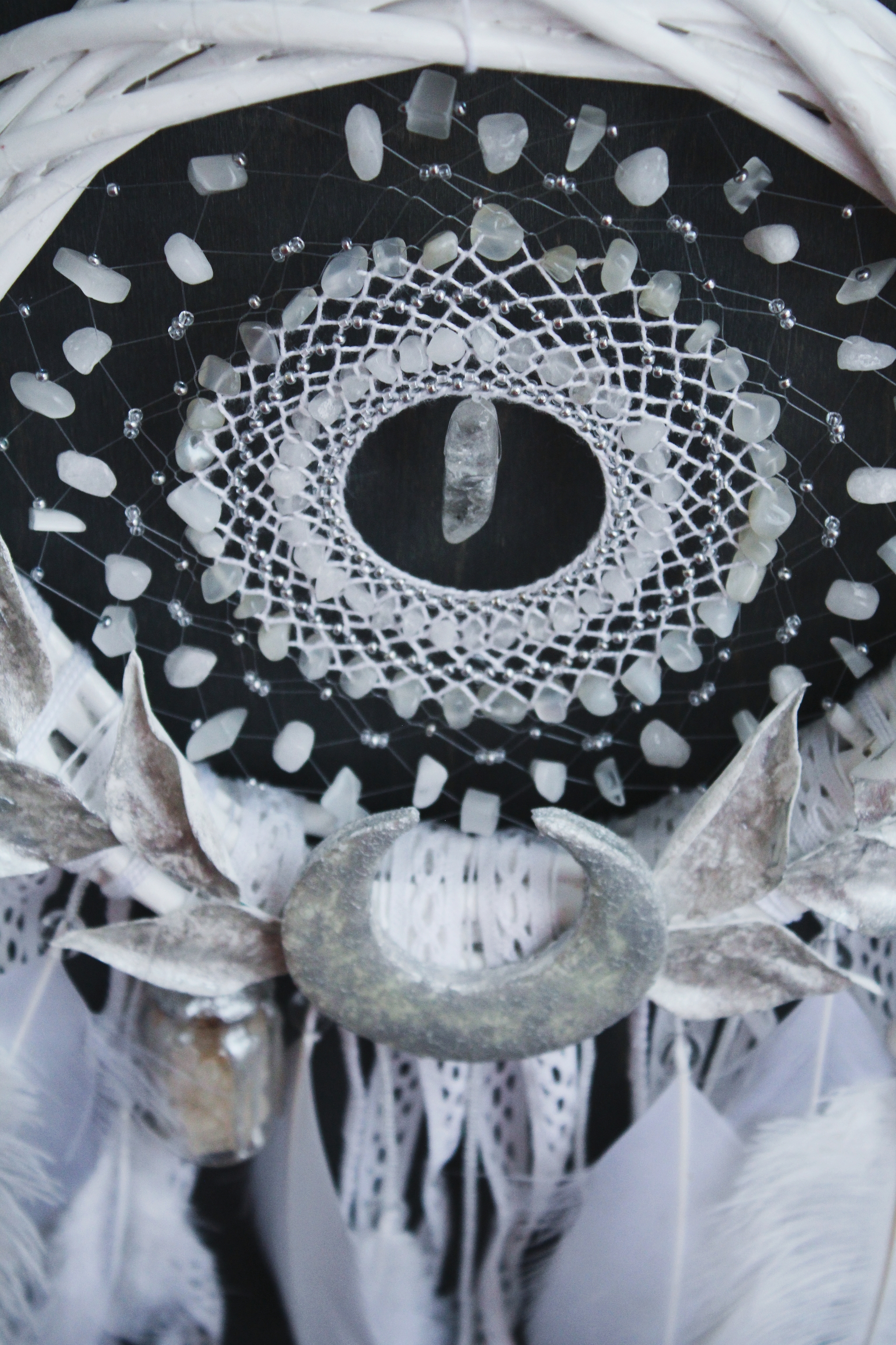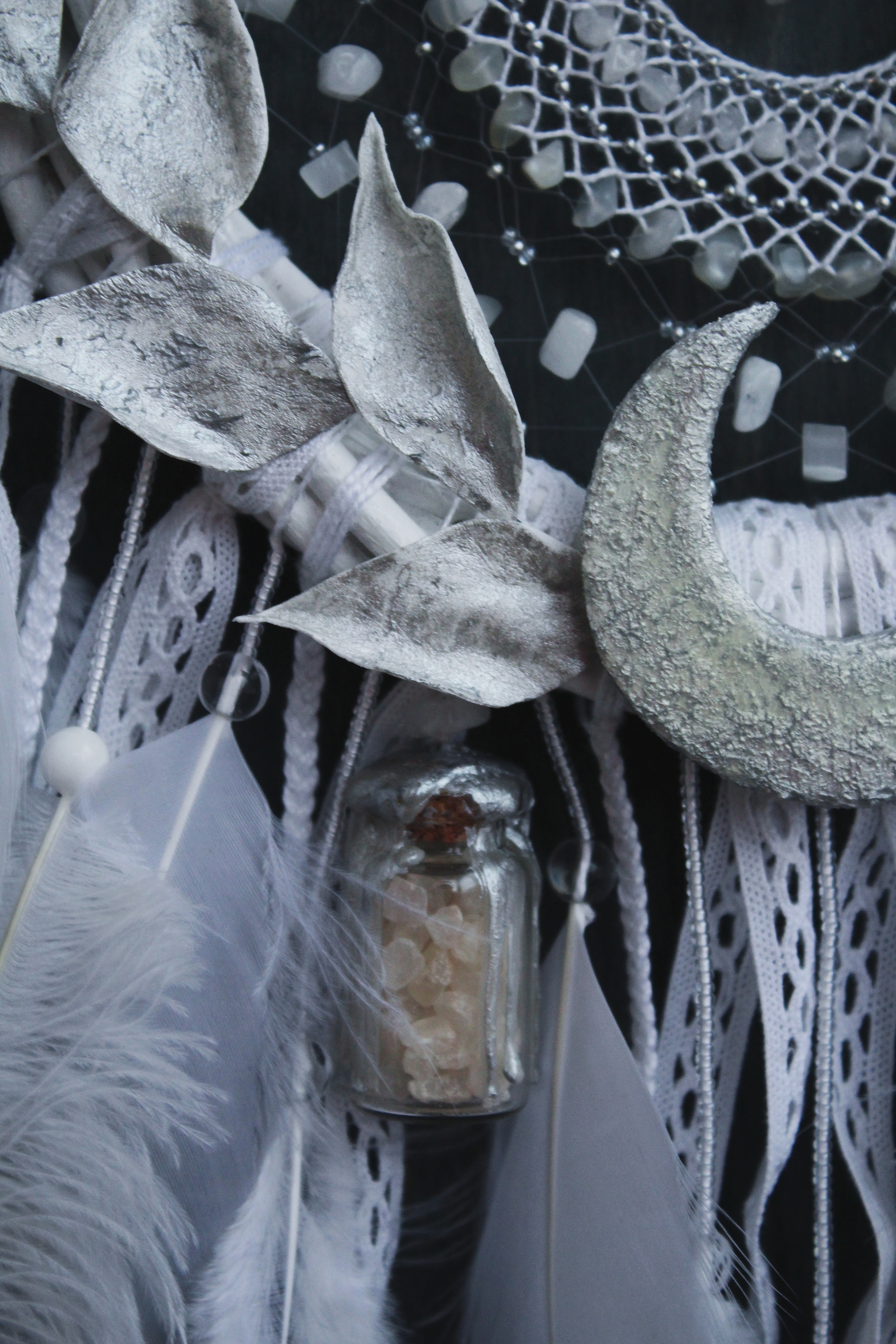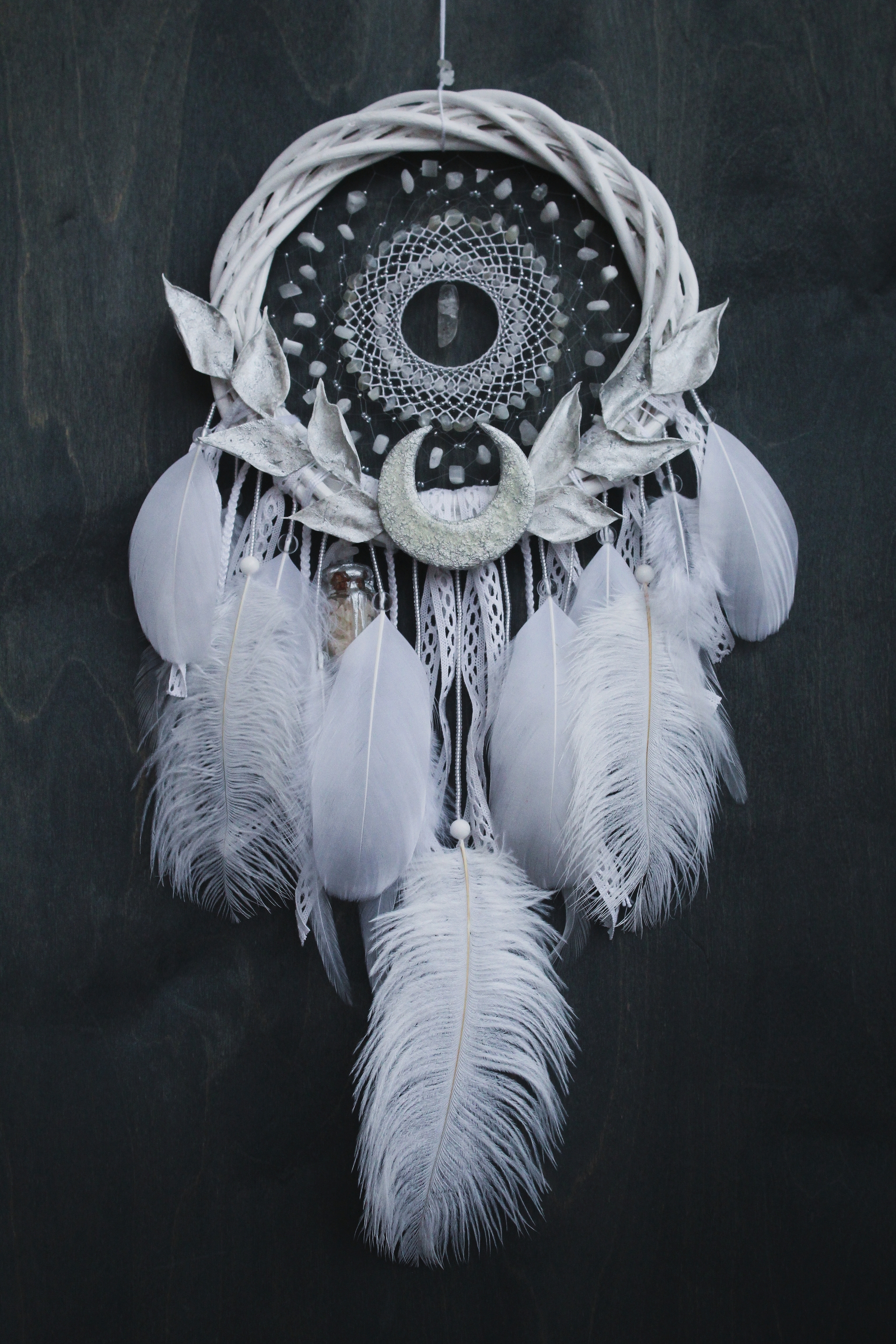 Для создания этого ловца я использовала кошачий глаз, лунный камень и бусины говлита, перья петуха, гуся и страуса.