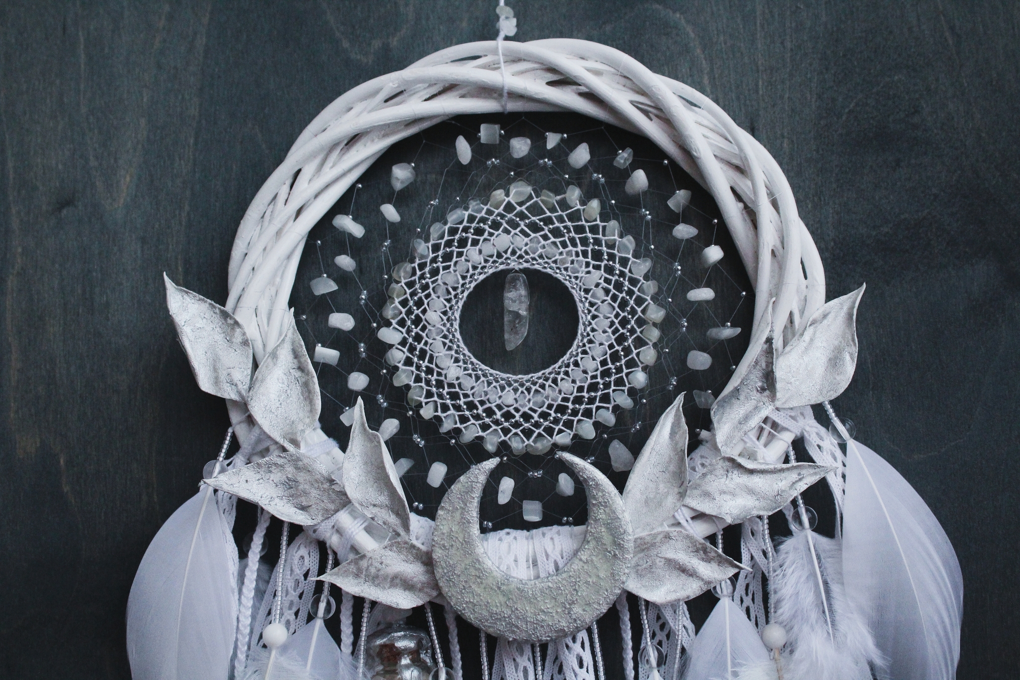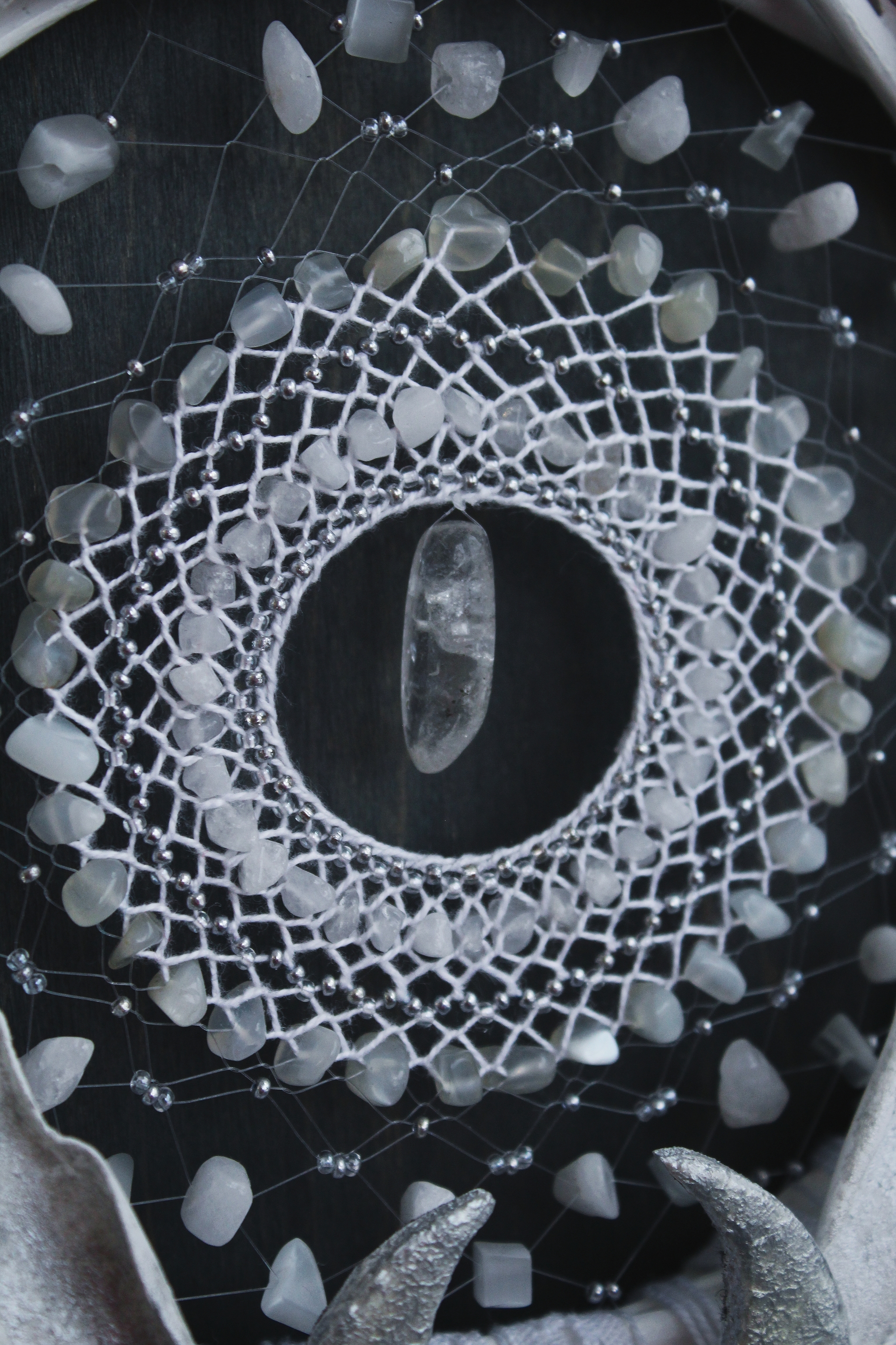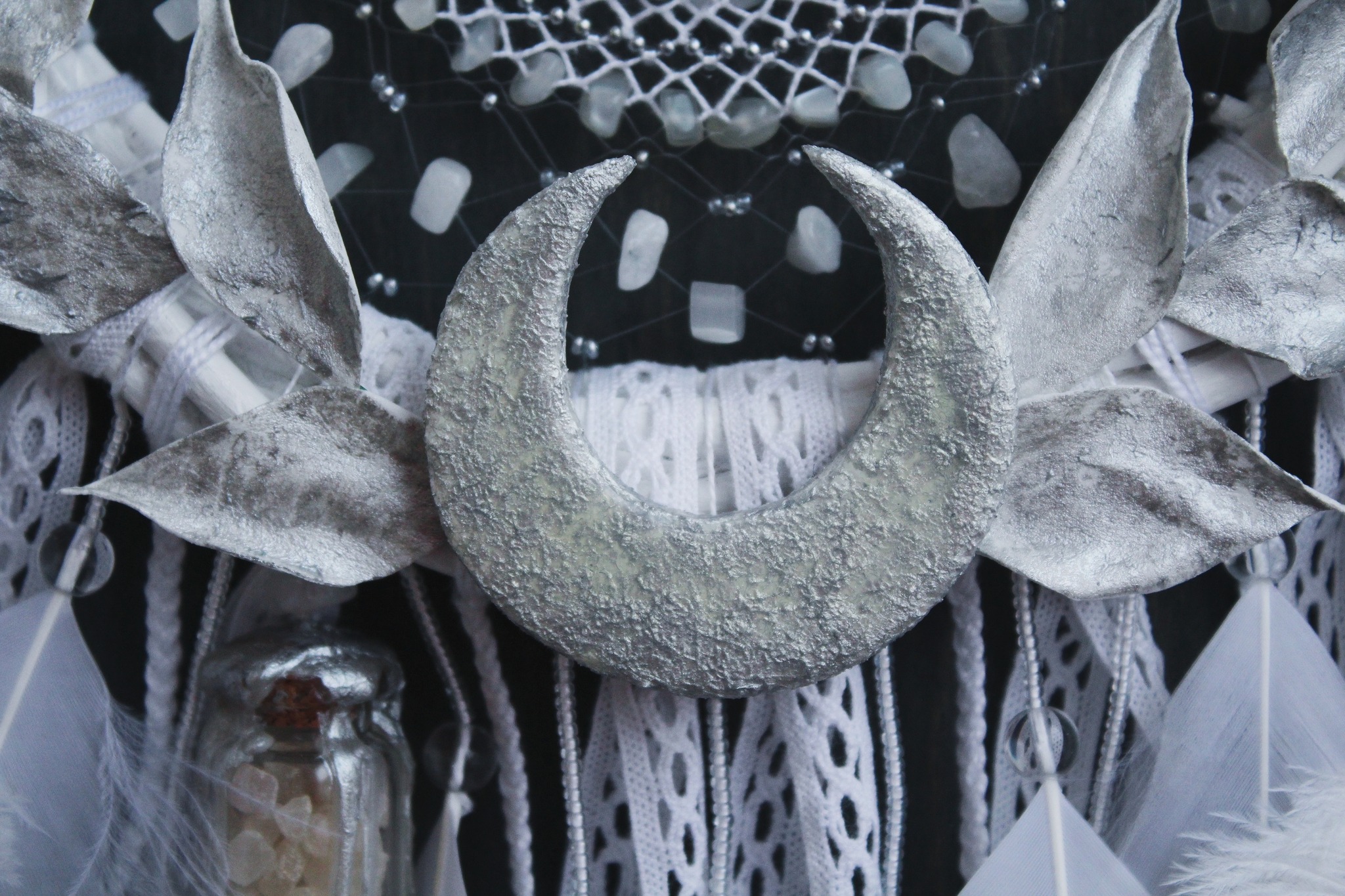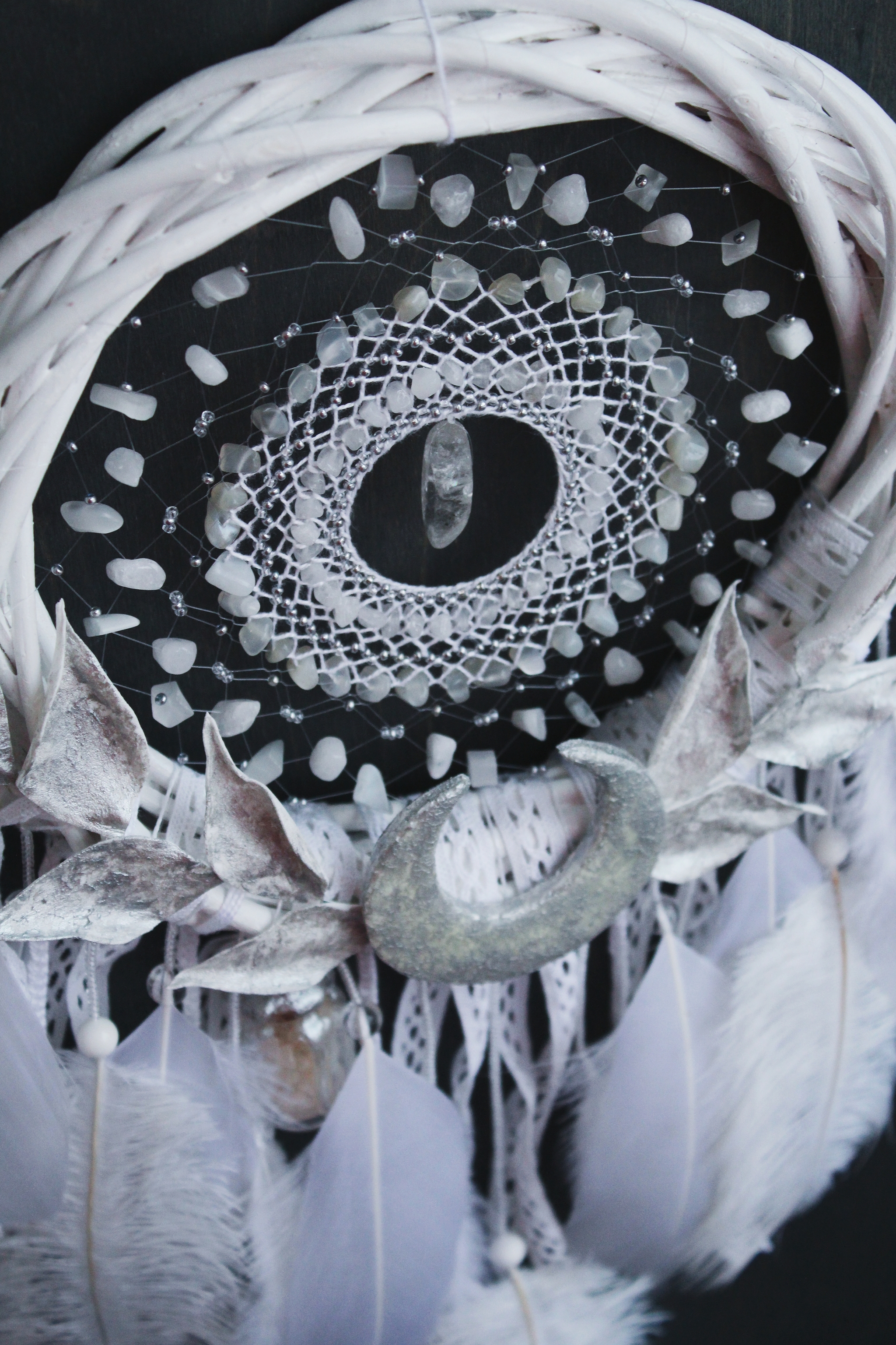 Для создания этого ловца я использовала кошачий глаз, лунный камень и бусины говлита, перья петуха, гуся и страуса.