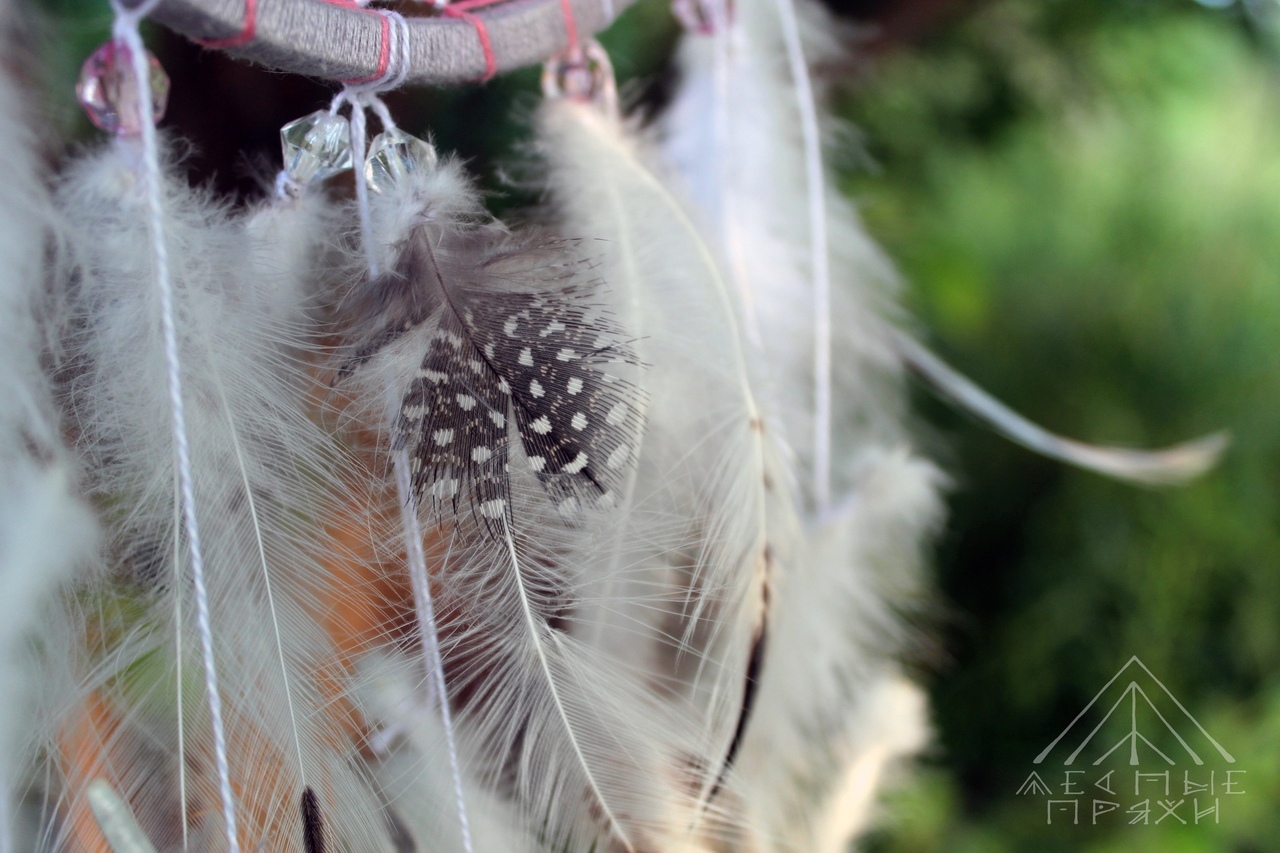 Берёзовая фанера, хлопковая нить, акриловые бусины, металлическая фурнитура, перья журавля, петуха и цесарки.