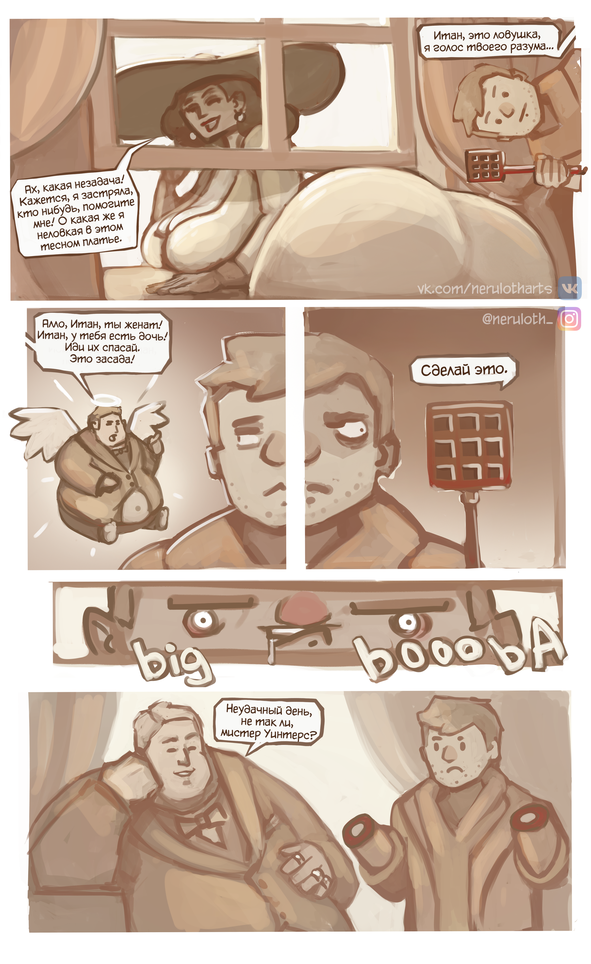 Resident Evil, Итан, Димитреску, мухобойка, потворствующая фетишам. Обещал второй комикс? и вот он) Гоняться за Итаном по лабирантам замка? Зачем? Когда есть древний проверенный способ- ловля на жопц... живца.