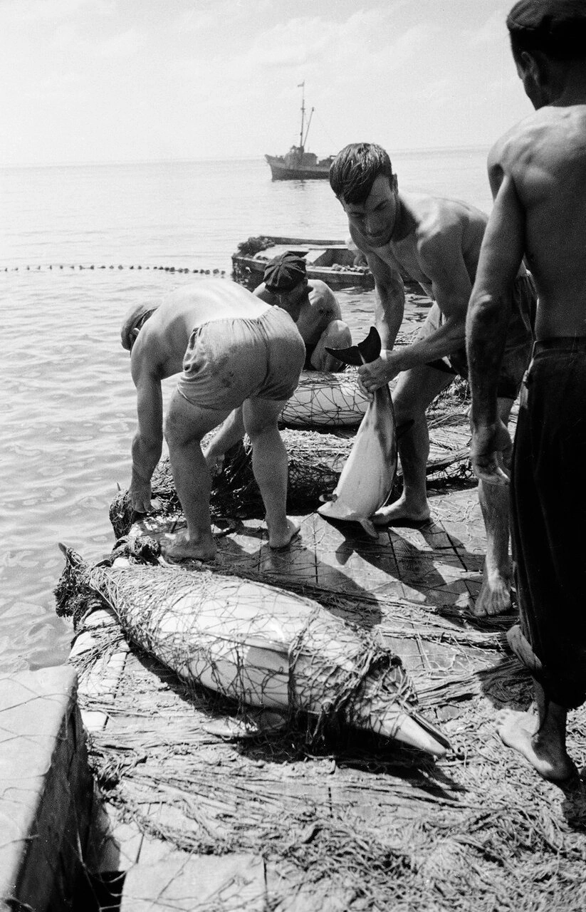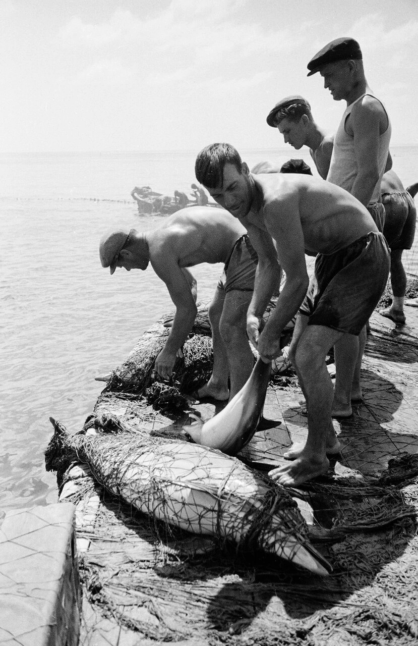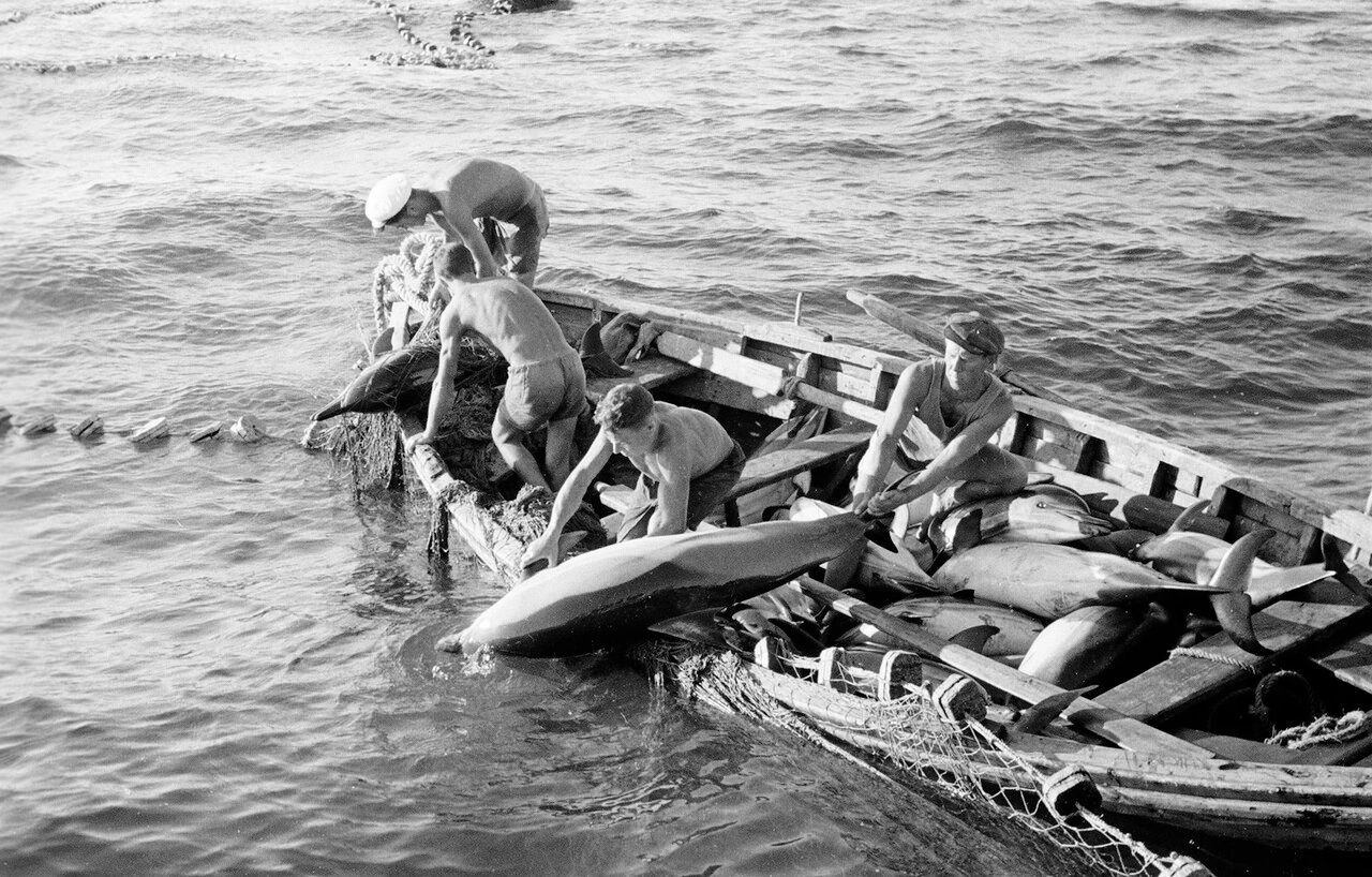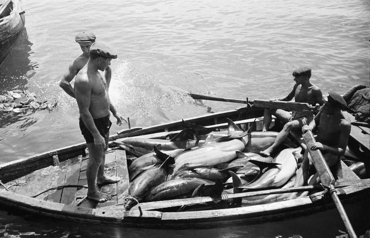 Мясо дельфинов поступало на полки в магазины после Великой Отечественной войны .