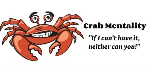 Таким образом, термин «менталитет краба» используется для описания эгоистичного, близорукого мышления, которое настроено на установку «Если я не смогу, то и вы не сможете»."