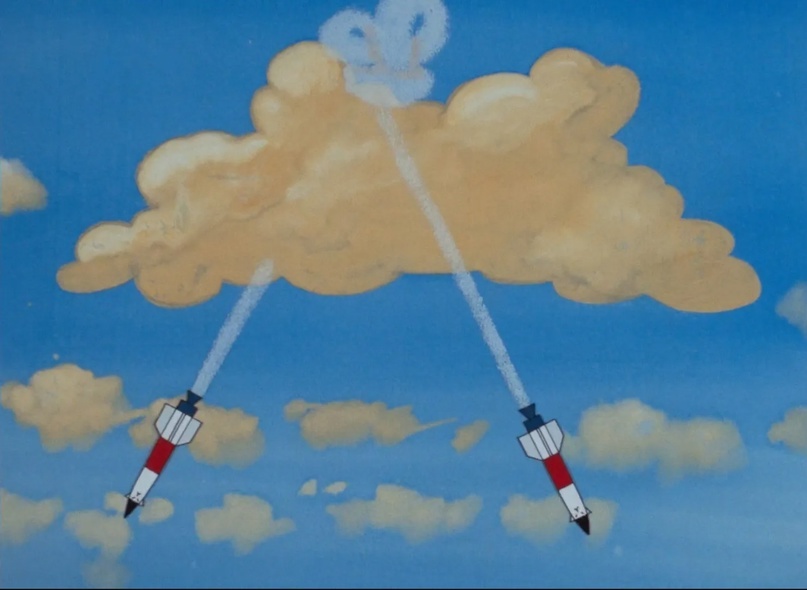 Хотя, конечно, ничто не сравнится с ракетами, которые запутались в своих же следах. Потом это облако начинает дождить прямо над Грабовским, который спрыгнул с самолёта, и Грабовский раскрывает парашют только затем, чтобы его подружка не промокла.