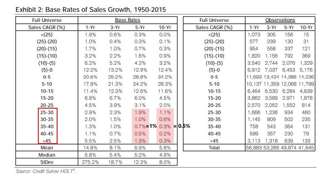 Исследование Майкла Мобуссина показывает, что только 1,3% компаний исторически имели средний рост выручки в течение 5 лет выше 45%. А если посмотреть на среднее значение, то только 1% компаний имели рост выручки выше 25% на интервале 5 лет и всего 0,5% на интервале 10 лет.