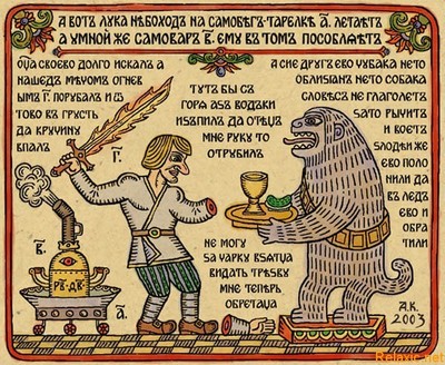 Поглядите, люди добрыя, как богатырь с проклятым супостатом борется! Его Г-дня Тень из пищалей стреляет, а богатырь рогулькою в Него запущает!