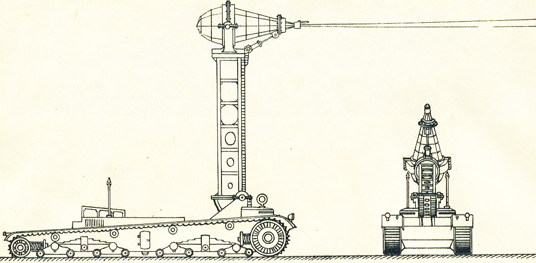 В 1930-е гг была популярна тема "лучей смерти", основанных как на электромагнитных, звуковых и прочих излучениях, так и на гипотетических иных физических принципах. Данная схема ещё и напоминает гиперболоид инженера Гарина.