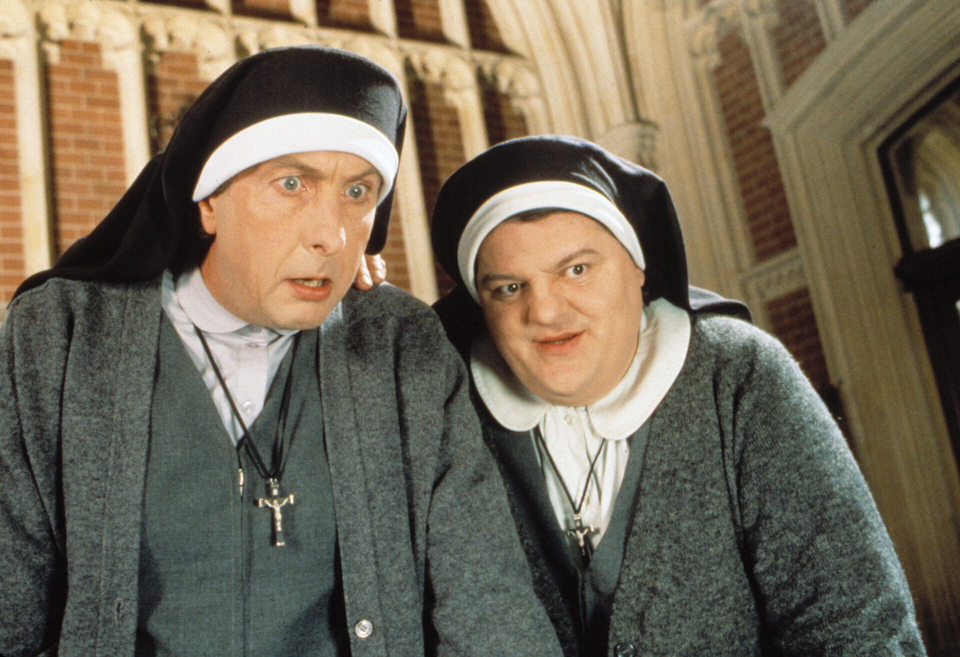 "Монахини в бегах" (Nuns on the Run / 1990) Львиная доля событий разворачивается в стенах женского монастыря. Сюда судьба забрасывает двух незадачливых преступников Брайена Хоупа и Чарли МакМануса, которые украли у своих «сотоварищей» пару чемоданов с деньгами и попытались найти местечко, где можно было бы пересидеть. В монастыре им пришлось не только переодеться, но и поменять имена...