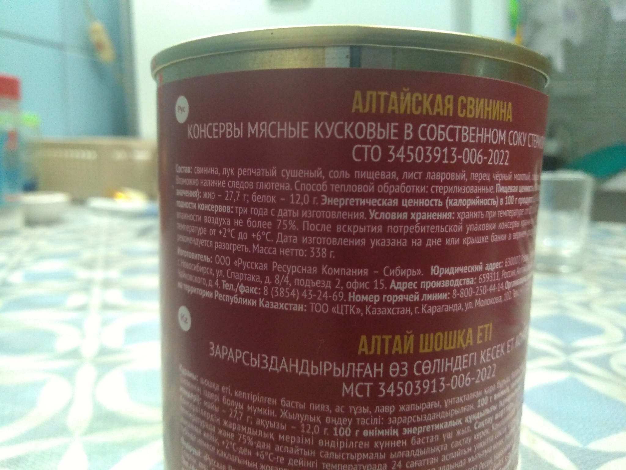 Давно покупаю в магазинах "Находка" тушенку из говядины производителя ООО "Русская Ресурсная Компания - Сибирь", адрес производства в Алтайском крае в г. Бийск. Сегодня увидел тушенку из свинины того же производителя. Цена пока что демпинговая 99 рублей. (Говядина 129) это реально лучшая тушёнка, из тех которую я пробовал. Мало жира и совсем нет жилок. Если в вашем городе есть сеть магазинов "Находка", или встретите её ещё где нибудь, не сомневаетесь и берите. Гарантирую, что не пожалеете. Пробовал тушенку и по 300 руб., но она была хуже этой.