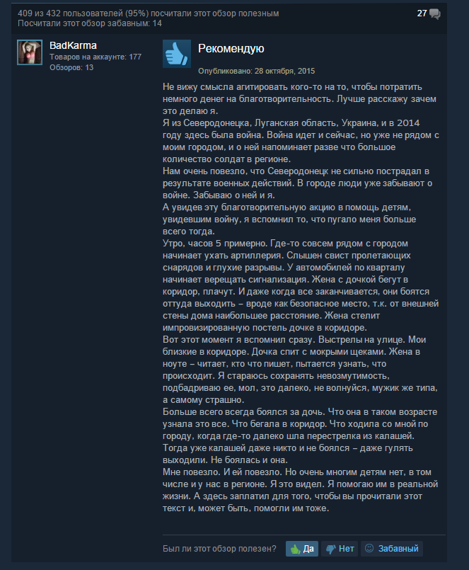 Ковыряясь сегодня в Стиме, решил посмотреть, какая же игра или дополнение с самыми положительными отзывами, что развлечь себя на выходных. И я удивился когда увидел This War of Mine - War Child Charity DLC. Что самое удивительное 524 отзыва положительных и ни одного отрицательного практически за год. Да что же там? Играл в саму игру, было тяжело, страдался, но прошел с первого раза, поразила гнетущая атмосфера и натуральное сопереживание героям. Не читая доп.информации сразу кинулся смотреть, что написали игроки. Что же там пишут: