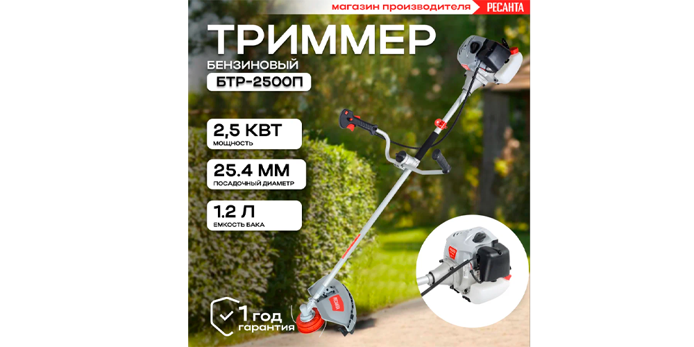 Следующий участник из среднего сегмента цен Ресанта БТР-2500П выделяется более высокой мощностью в 3,4 л. с. и 2500 Вт. При этом двухтактный двигатель развивает скорость до 9500 об/мин, что позволяет дольше работать в непрерывном режиме при обработке больших площадей, а также лучше справляться с серьезными зарослями, включая поросль деревьев, кустарников и толстые стебли сорной травы.