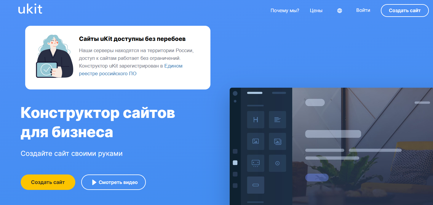 Ukit — конструктор сайтов, ориентированный на малый бизнес, с базовыми возможностями продвижения в поиске.