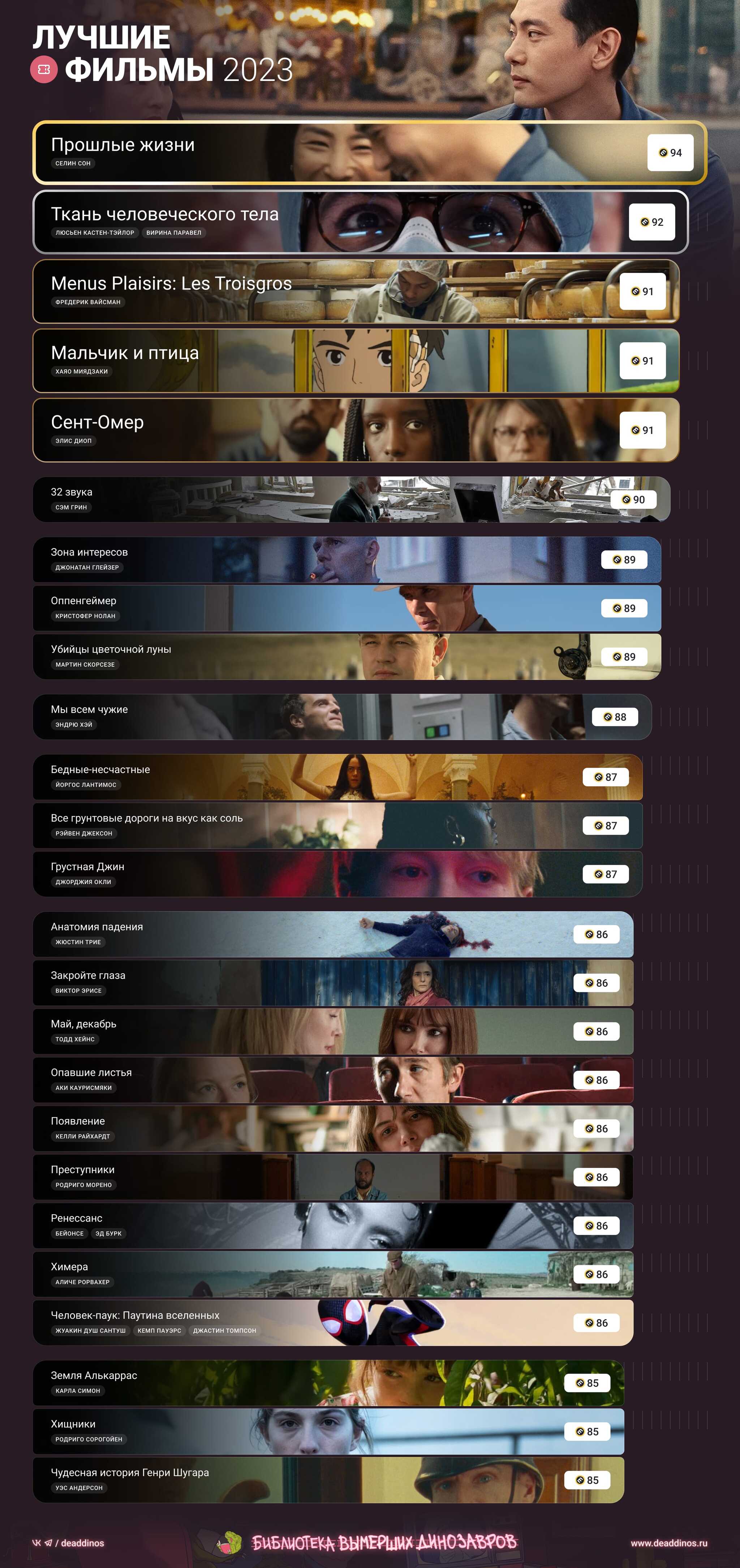 Перед вами 25 фильмов, которые вышли в американский прокат в 2023-м году и получили самые высокие баллы на Metacritic (крупнейший сайт-агрегатор, собирающий рецензии на фильмы, игры и сериалы). Это не топ в привычном понимании — скорее срез, демонстрирующий предпочтения не отдельных людей, а зарубежной критики в целом.