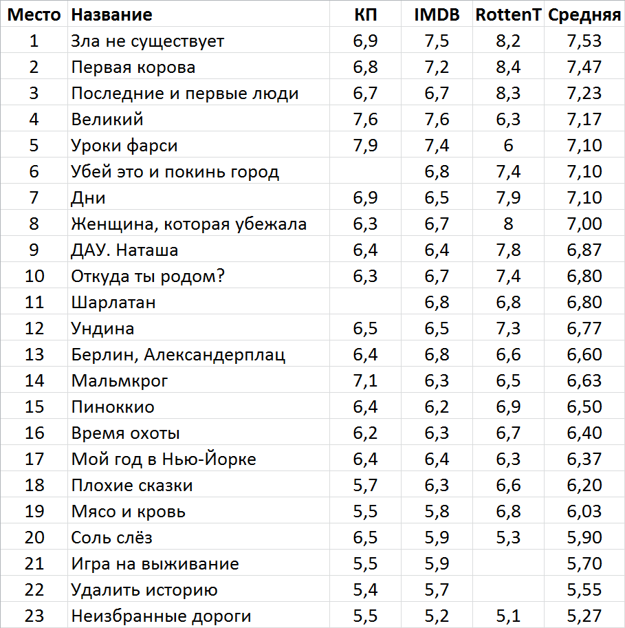 Таблица с рейтингами Кинопоиска, IMDB и Rottentomatoes.