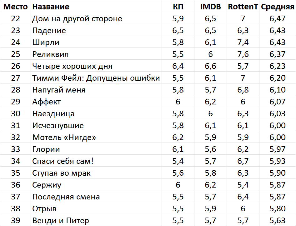 Таблица с рейтингами Кинопоиска, IMDB и Rottentomatoes.