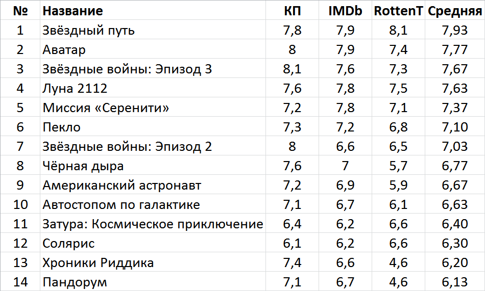 Таблица с рейтингами Кинопоиска, IMDb и Rottentomatoes.