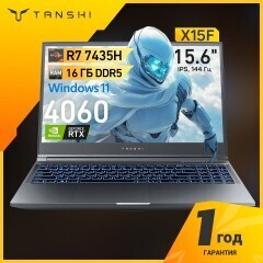 TANSHI X15F — бюджетный игровой ноутбук с процессором AMD Ryzen 7 7435H (8 ядер, до 4.5 ГГц) и видеокартой RTX 4060 (8 ГБ). 16 ГБ DDR5, SSD на 512 ГБ и экран 15.6" Full HD 144 Гц с Windows 11.