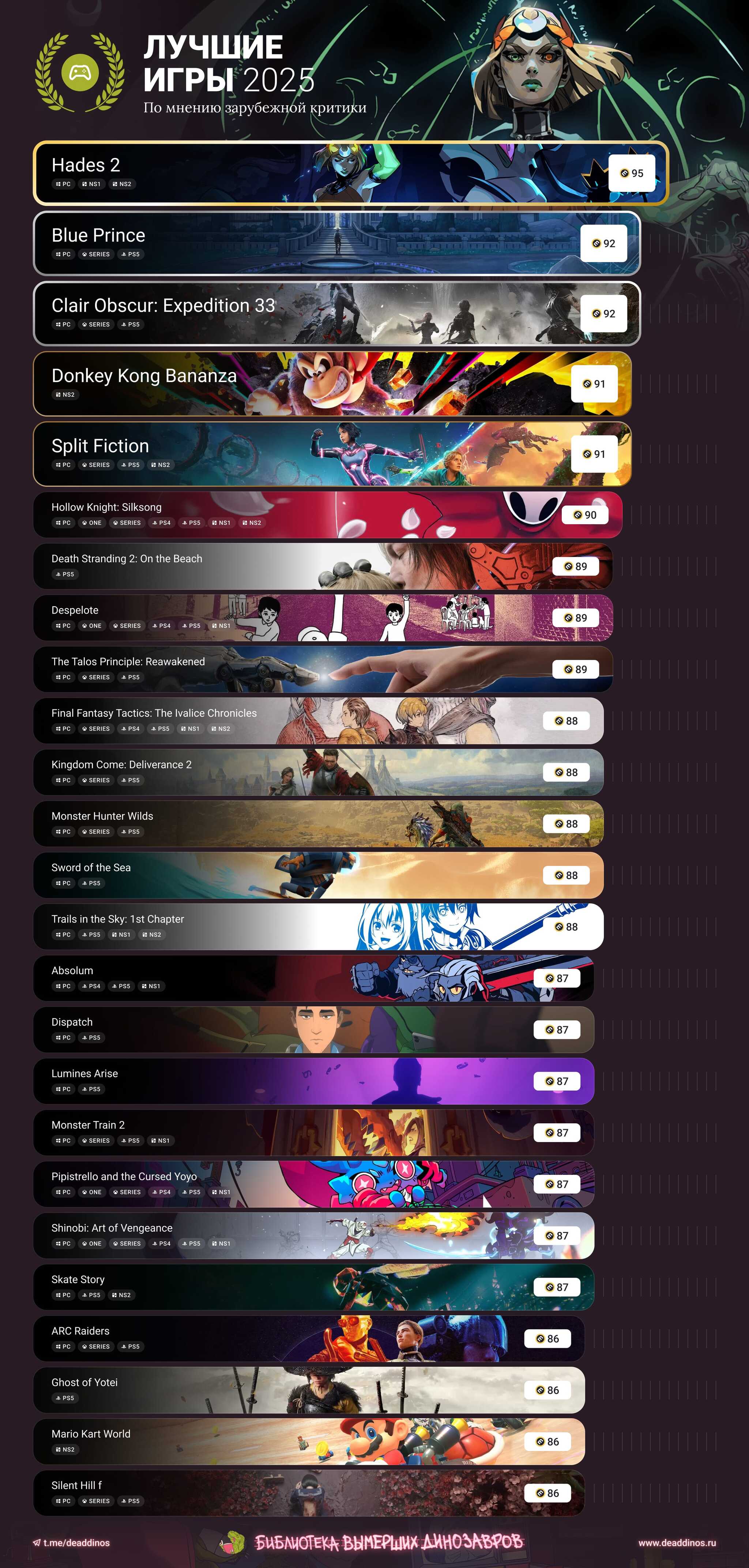 Перед вами 25 игр 2025-го года, которые получили самые высокие баллы на Metacritic (крупнейший сайт-агрегатор, собирающий рецензии на фильмы, игры и сериалы). Это не топ в привычном понимании — скорее срез, демонстрирующий предпочтения не отдельных людей, а зарубежной критики в целом.