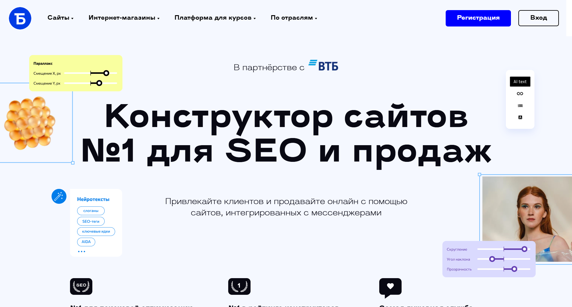 Редактор сайтов с полной свободой верстки и адаптивной настройкой под любые экраны.