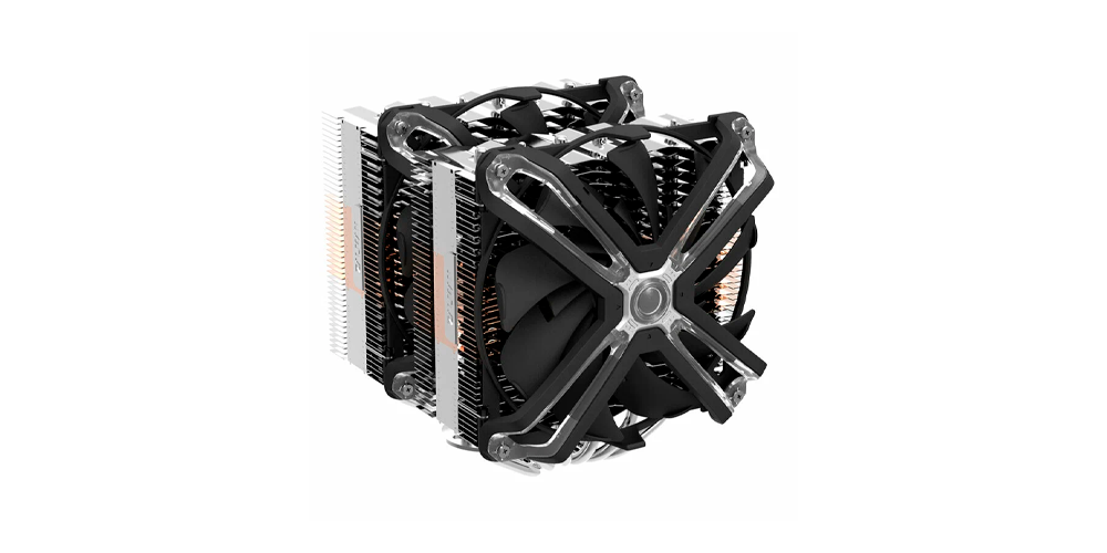 Так, 2 башни охлаждаются двумя винтами по 120 мм, максимальная скорость которых 1800 об/мин. Тут конструктивная особенность в том, что при желании можно ещё 1 винт прицепить. Но это вариант для тех, кому не лень заморочиться и проверить, есть ли в этом смысл, чтобы не было как с однобашенным Deepcool AS500 Plus, у которого второй винт для галочки.