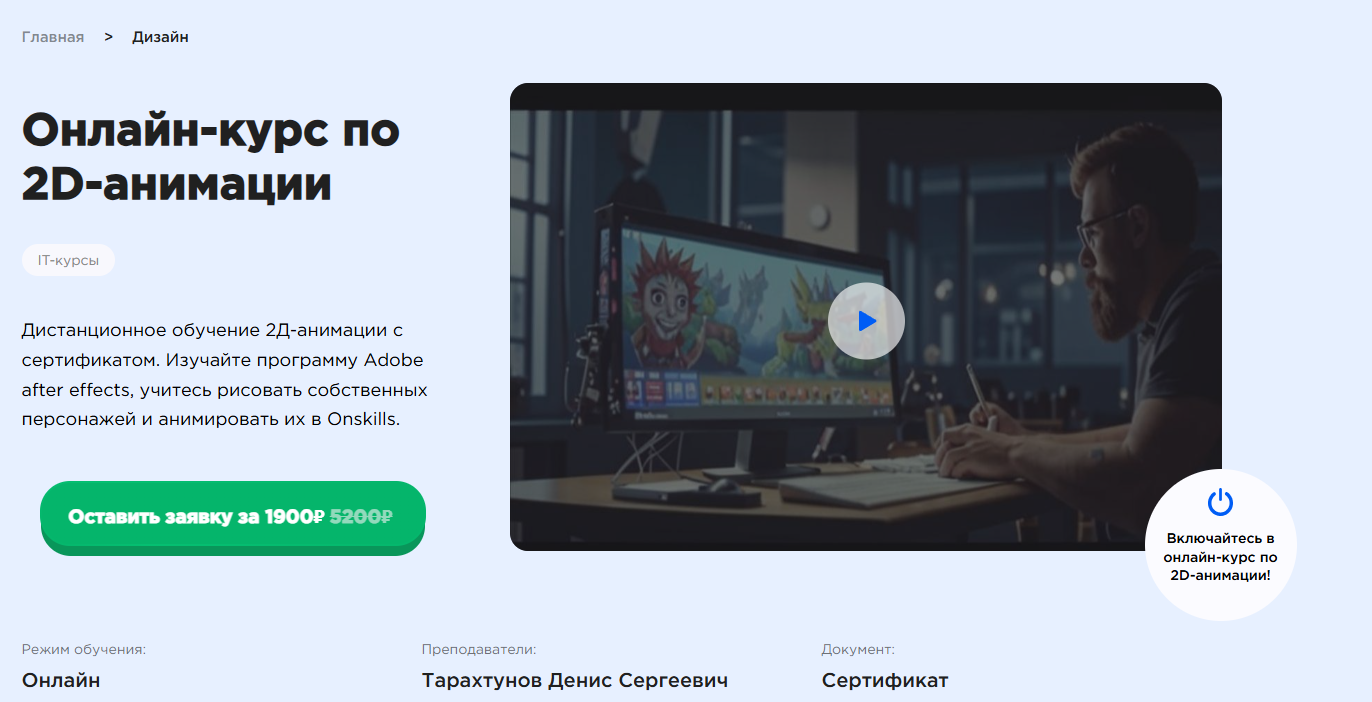 Онлайн-курс по 2D-анимации от Onskills — отличный вариант для начинающих мультипликаторов.