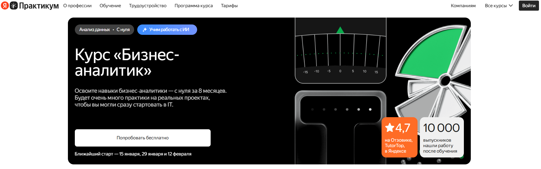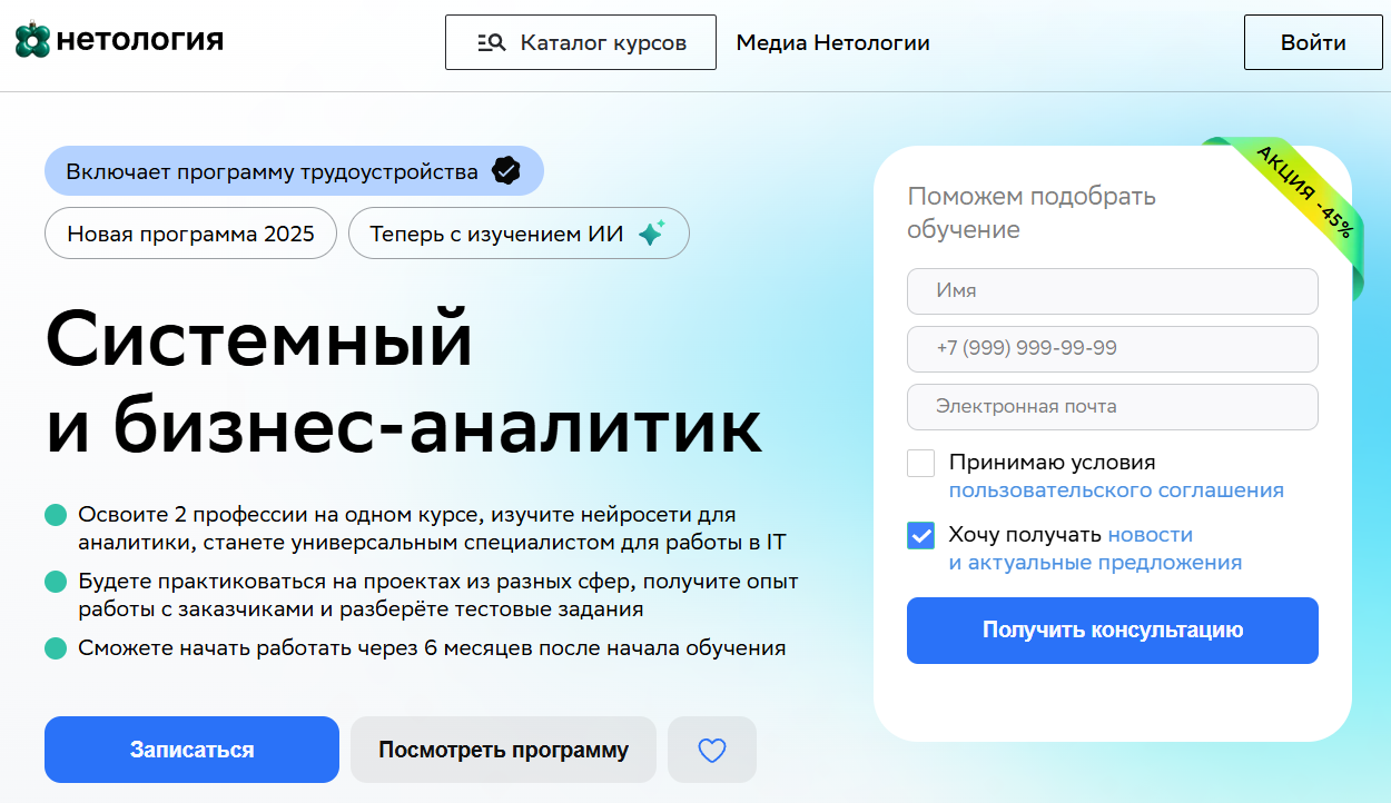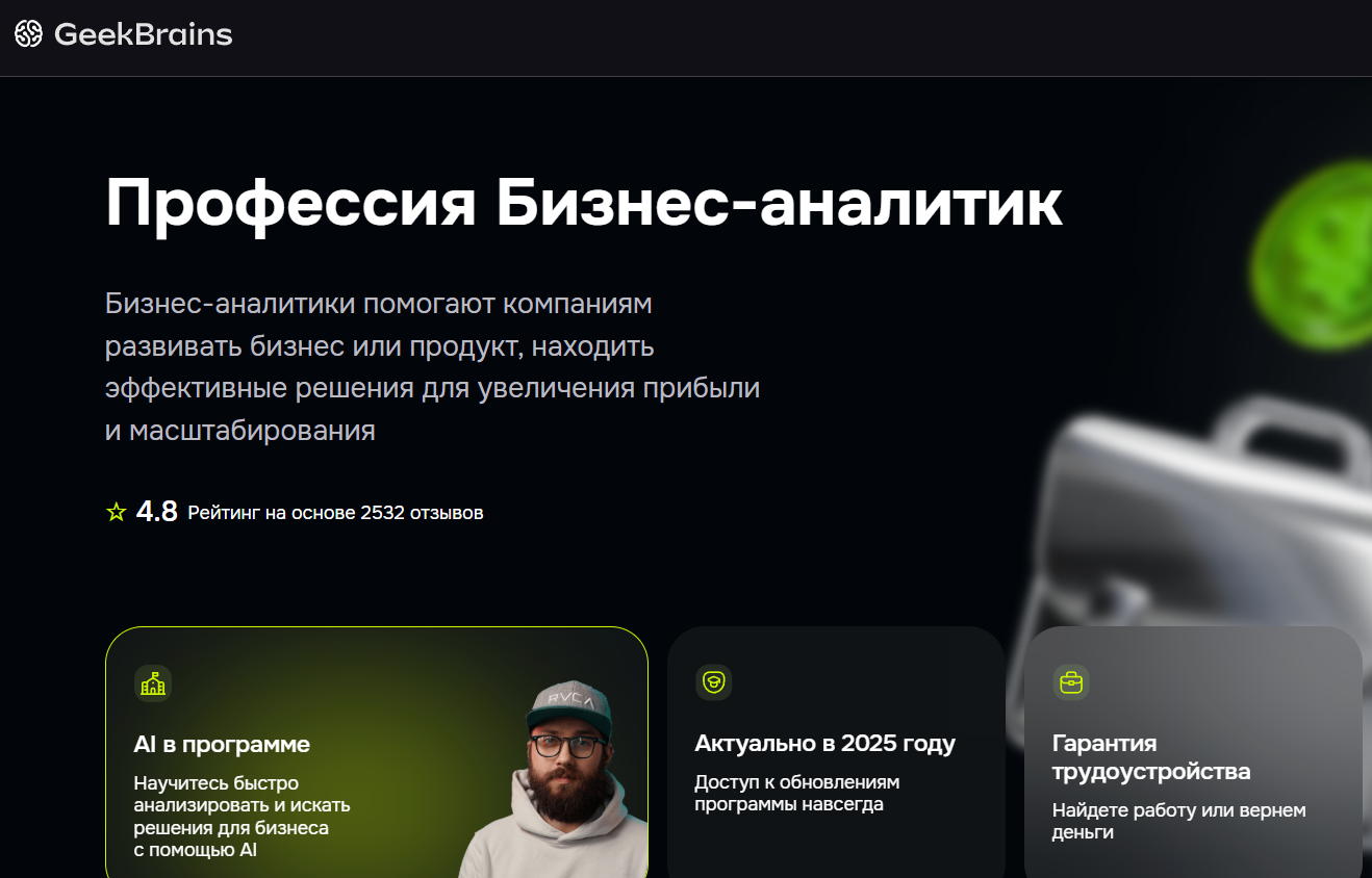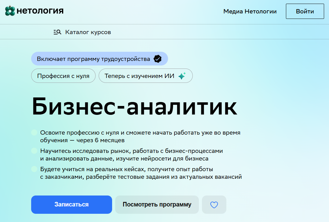 Сильные стороны: программа дает целостное представление о профессии и помогает связать аналитику с практическими задачами бизнеса. Подходит для старта карьеры бизнес-аналитика.