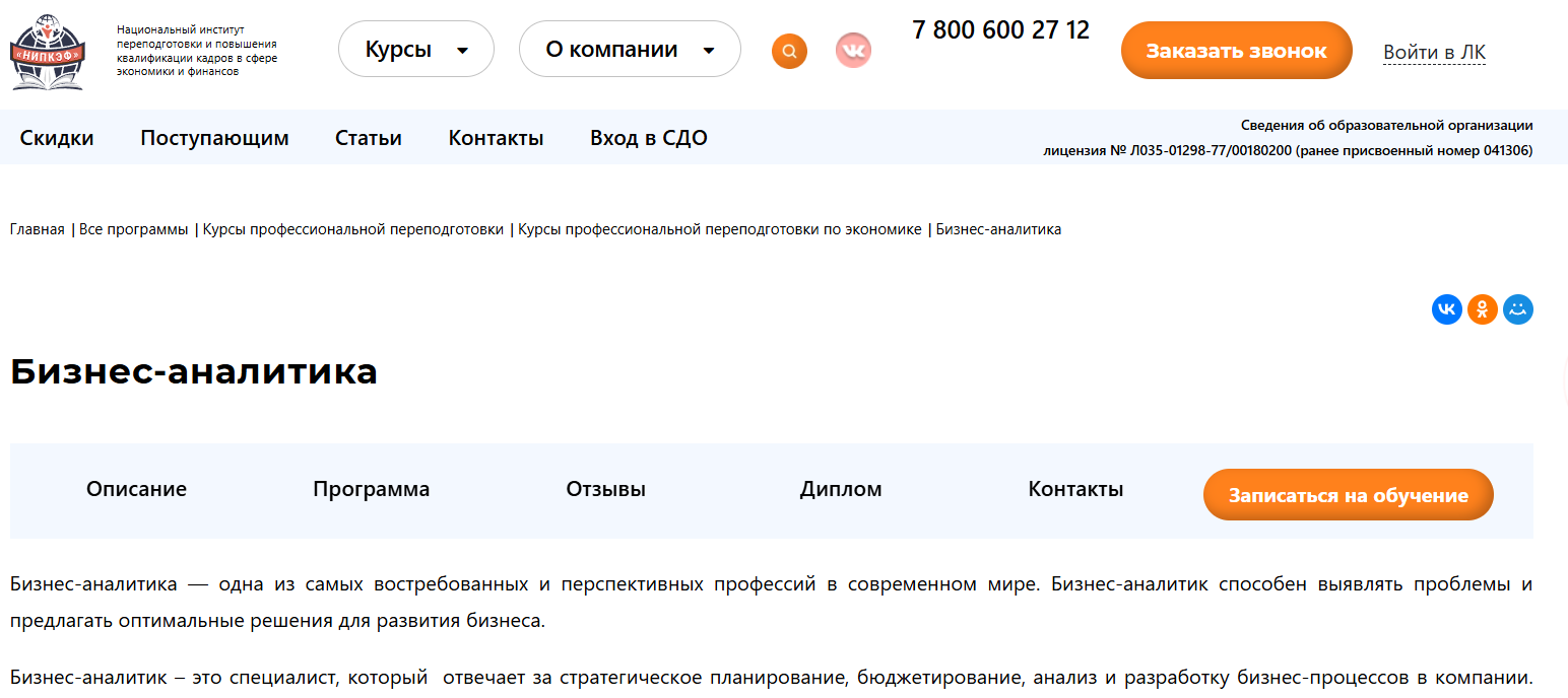 Курсы из этого раздела выбирают те, кто уже определился с направлением и планирует системно освоить профессию бизнес-аналитика. Такие программы, как правило, сочетают теоретическую базу и практику, позволяют разобраться в анализе бизнес-процессов и освоить инструменты, которые применяются в реальной работе. При этом стоимость обучения остаётся сопоставимой с объёмом и глубиной программы.