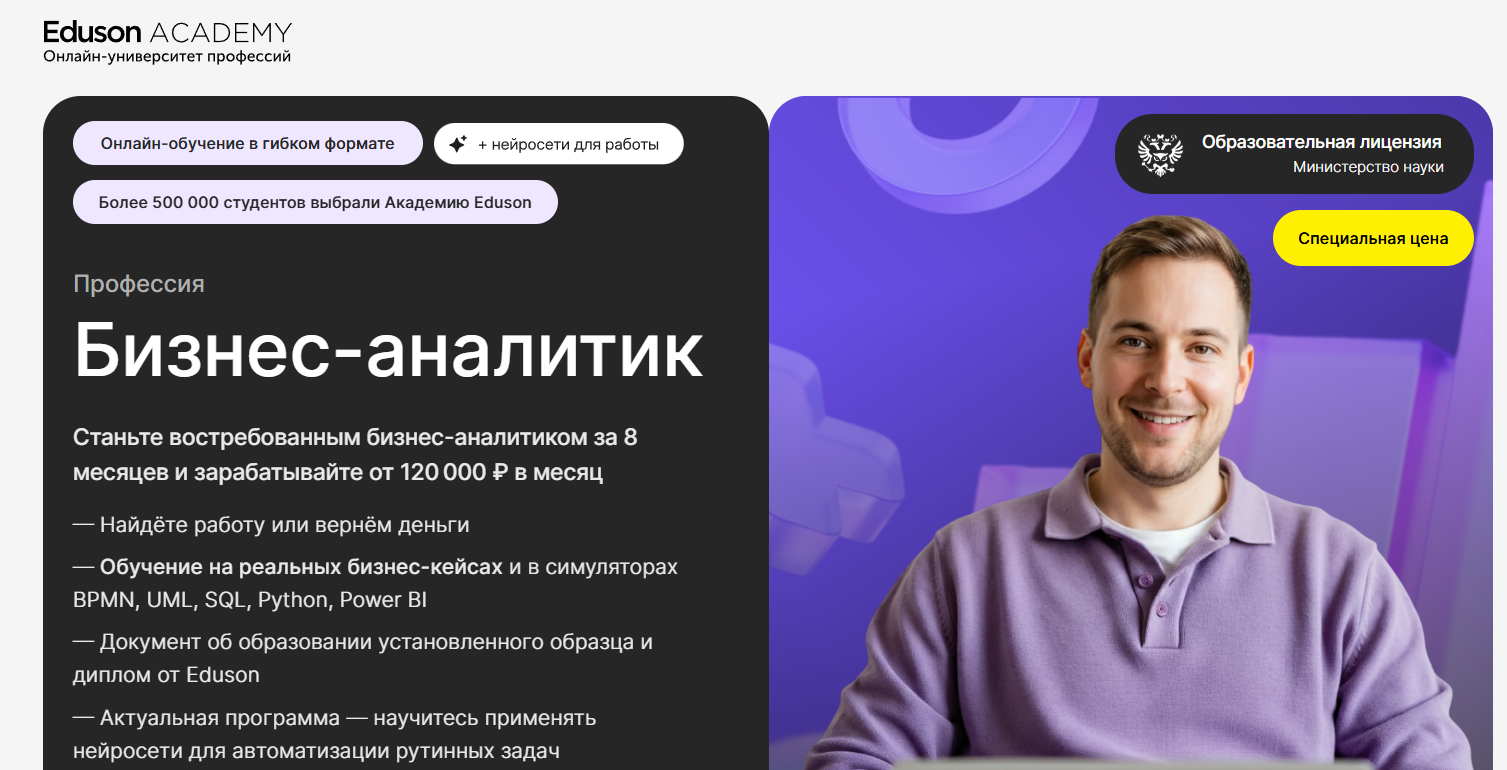 Курсы из этого раздела подойдут тем, кто рассматривает профессию бизнес-аналитика как новое направление карьеры и не имеет профильного образования или опыта работы в аналитике. Такие программы выстраиваются по принципу поэтапного обучения: от понимания логики бизнес-процессов до освоения инструментов анализа и подготовки аналитических решений. Многие из них относятся к формату профессиональной переподготовки и предполагают выдачу диплома после завершения обучения.