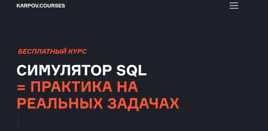 Практический курс, направленный на освоение SQL — одного из ключевых инструментов аналитиков. Обучение построено вокруг задач, которые имитируют работу с реальными базами данных. Тренажер часто используют как дополнение к основному обучению, чтобы получить прикладной технический навык.